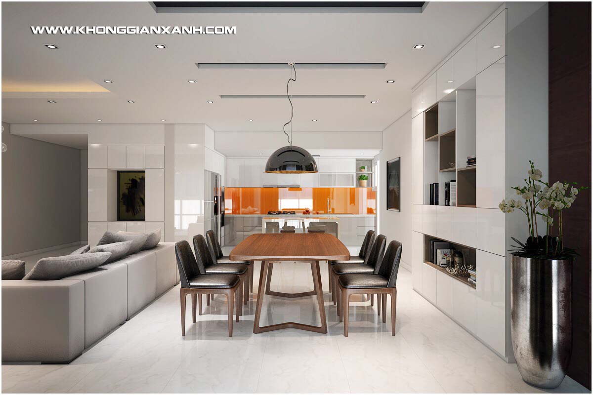 Phòng khách và bếp ăn được bố trí liên hoàn theo hướng mở, được nhấn bằng các nội thất gỗ được thiết kế mảng miếng nhẹ nhàng làm nổi bật khu bếp với kính cường lực màu cam nổi bật. Khu bàn ăn và vách ti vi được điểm nhấn với các mảng phối gỗ giữa màu sơn 2k và chất liệu phủ Acrylic hiện đại tạo nên nét hiện đại nhưng tiết giản chi tiết – một nhu cầu mà gia chủ đặt ra.