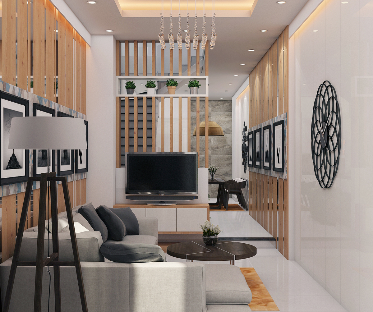 Các mảng tường chạy dài và hẹp là điểm yếu trong trang trí các ngôi nhà hẹp chiều ngang nay trở thành điểm nhấn sinh động và phân không gian cho tầng trệt công trình.