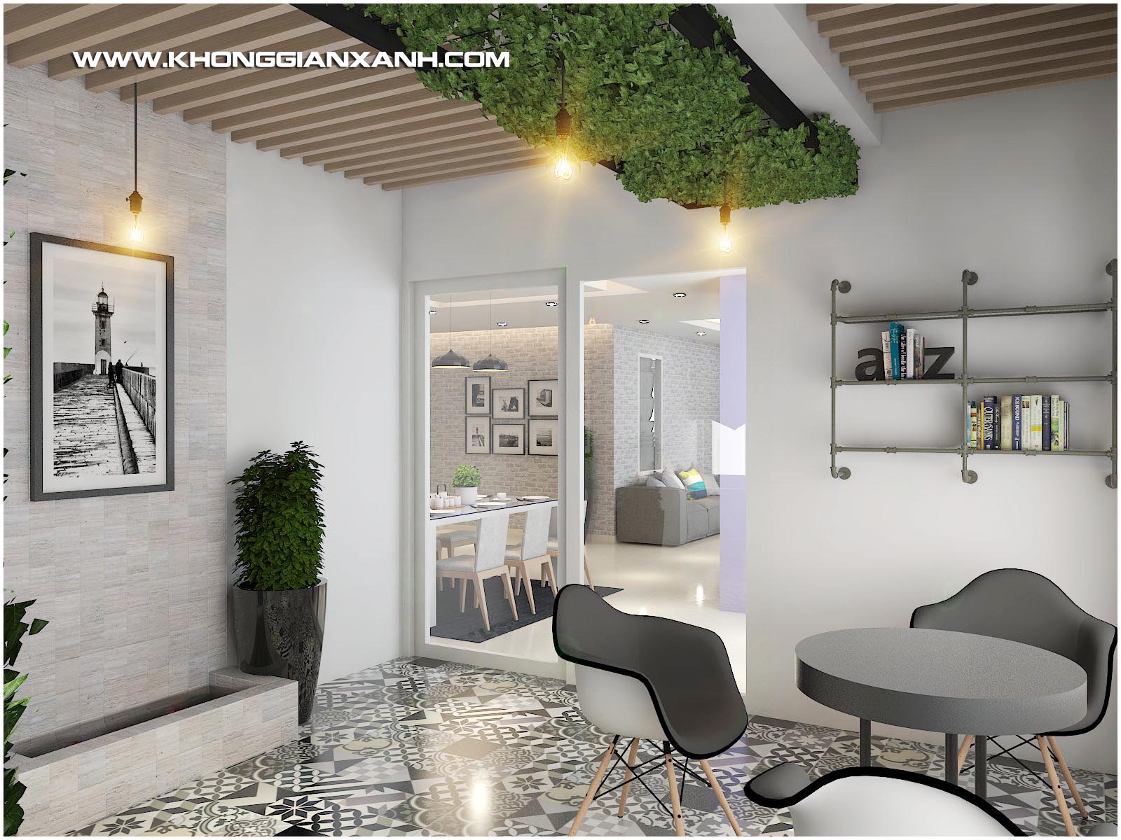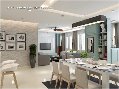 Phong cách thiết kế: Không gian mở hiện đại, với ton màu xanh ngọc chủ đạo, kết hợp các mảng phối gạch gợi nét cổ điển.