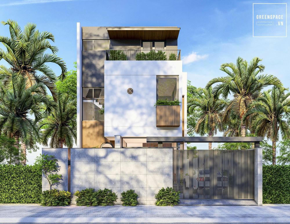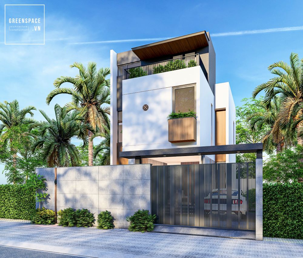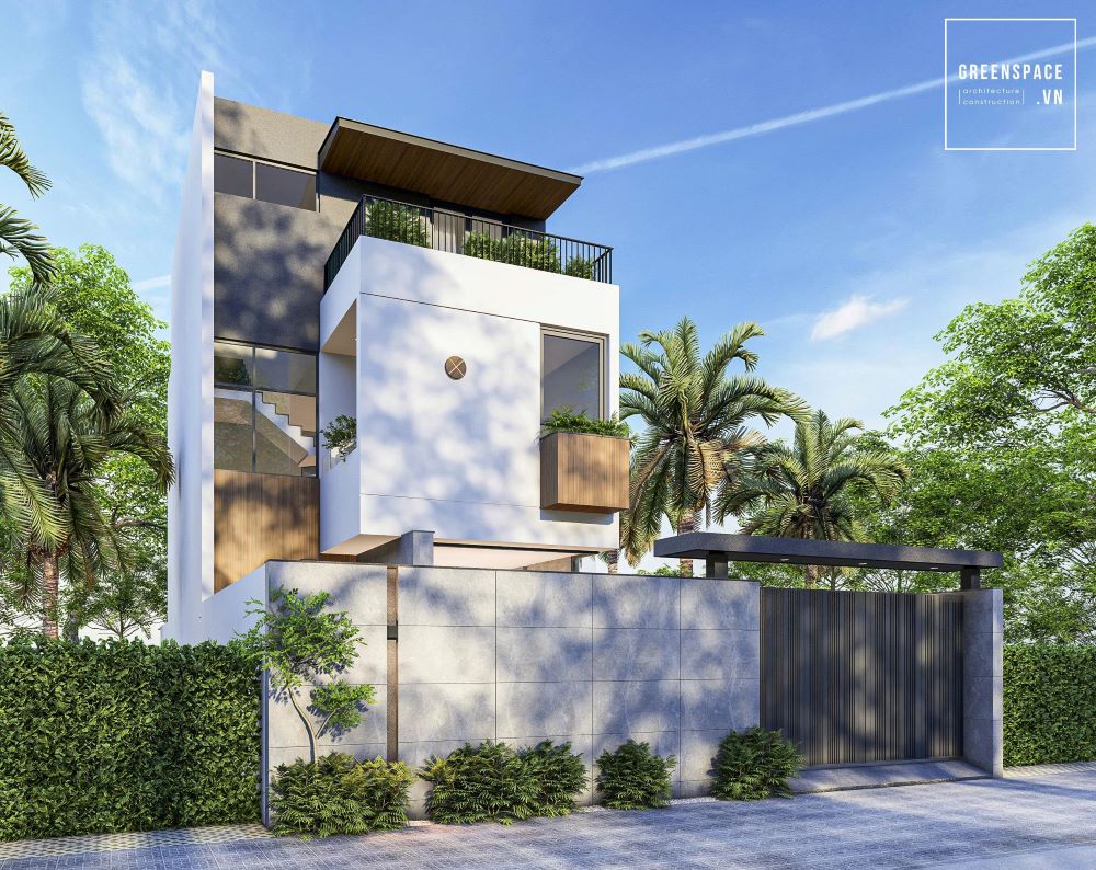 Khuôn viên biệt thự được bao quanh bởi hàng rào đá kết hợp với cổng sắt đen. Cây xanh và tiểu cảnh giúp không gian thêm phần mát mẻ, thư giãn. Thiết kế mái bằng với các hình khối vuông vức tạo sự vững chãi. Ban công nhỏ với lam gỗ giúp giảm bớt nắng gắt vào nhà.
