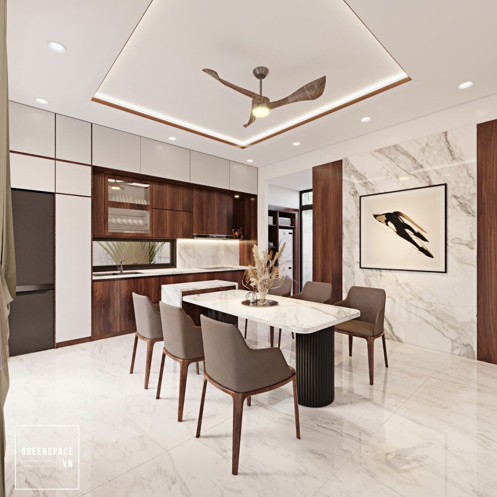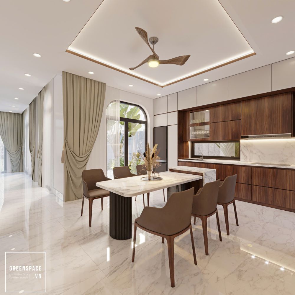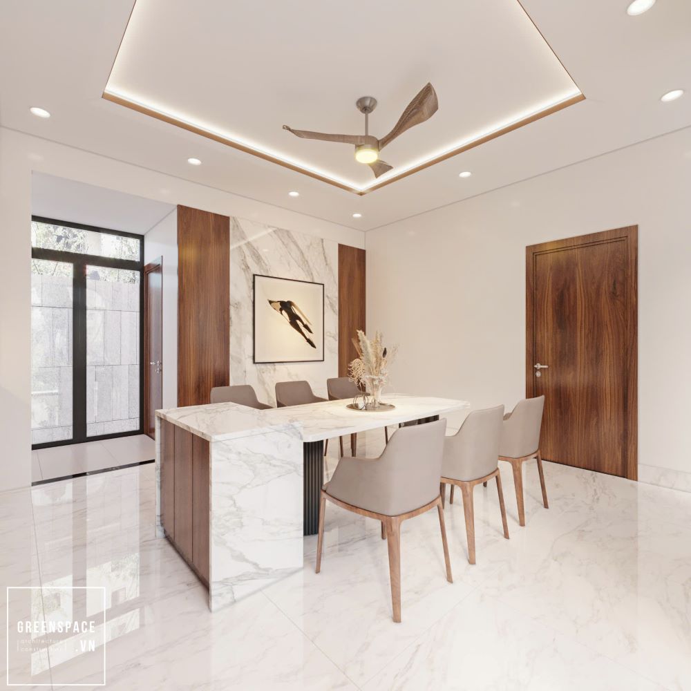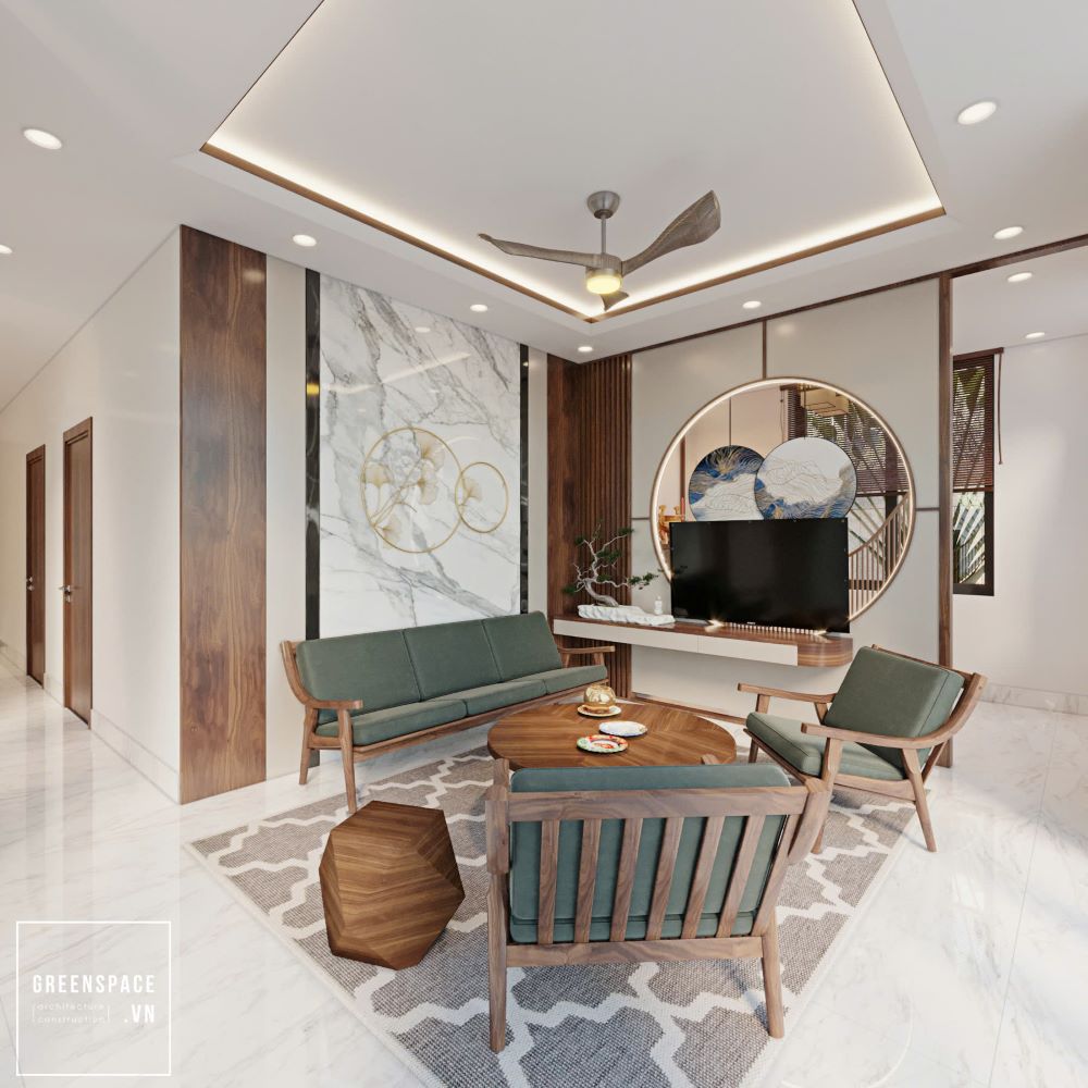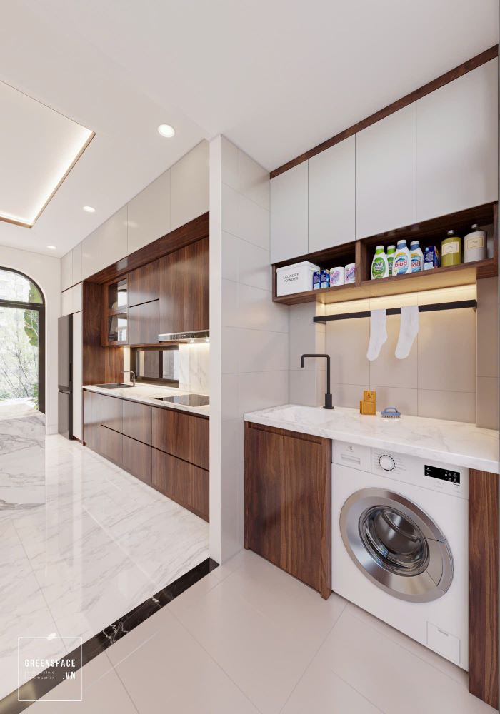 Không gian phòng khách sang trọng với sofa xanh nổi bật. Đèn trần hiện đại tạo điểm nhấn tinh tế. Khu vực thờ trang nghiêm, thiết kế tối giản. Bàn ăn rộng rãi, ghế bọc nỉ êm ái. Bếp hiện đại với gỗ và đá sáng màu. Khu giặt nhỏ gọn, tiện lợi. Phòng ngủ chính tối giản, giường lớn thoải mái. Tủ gỗ âm tường tăng không gian lưu trữ. Phòng thay đồ tiện nghi, ánh sáng chan hòa. Nội thất gỗ kết hợp trắng tạo sự ấm áp. Tivi treo tường tối ưu diện tích. Không gian phòng ngủ phụ vẫn thoáng đãng.