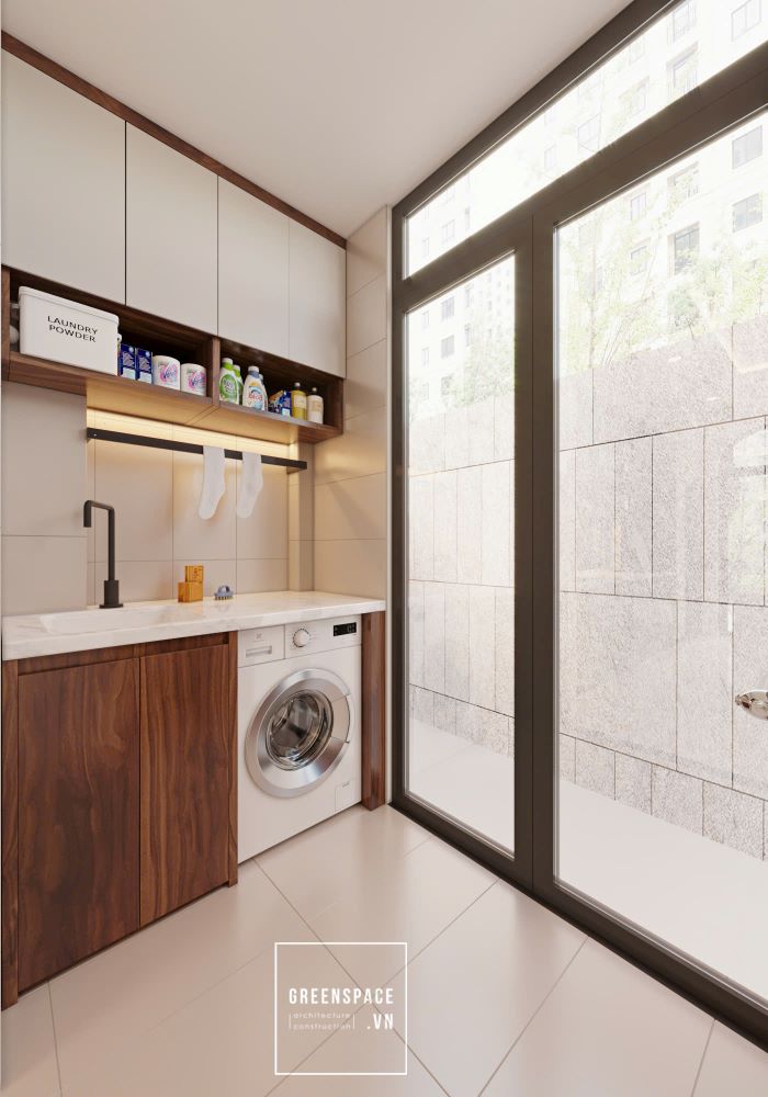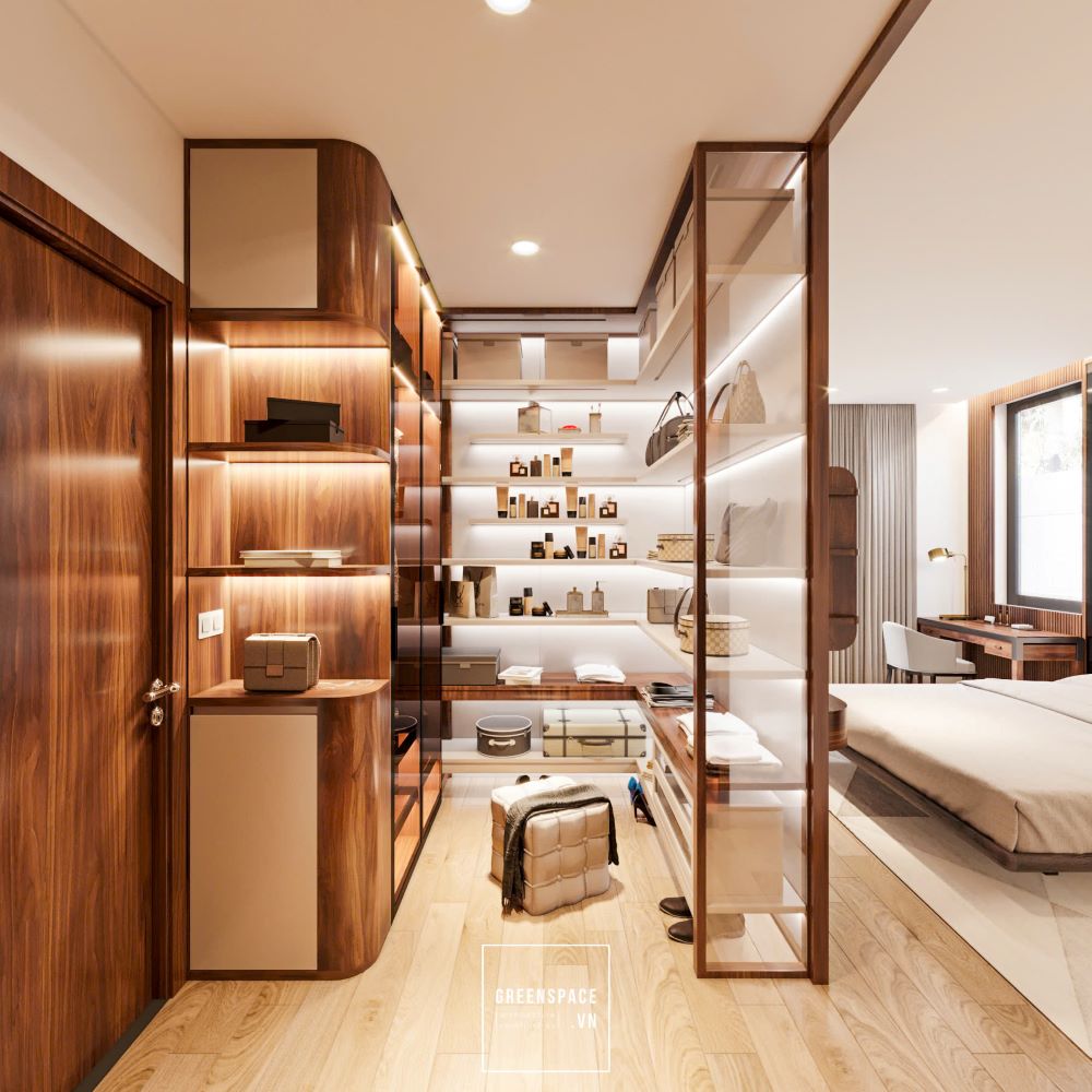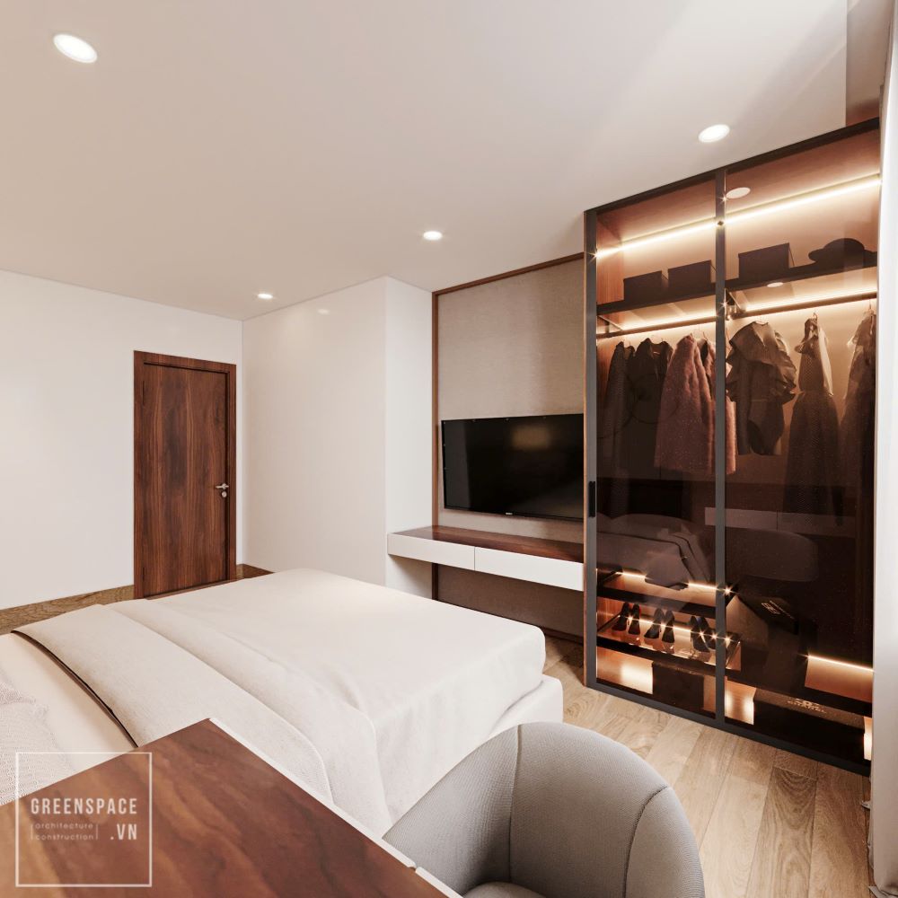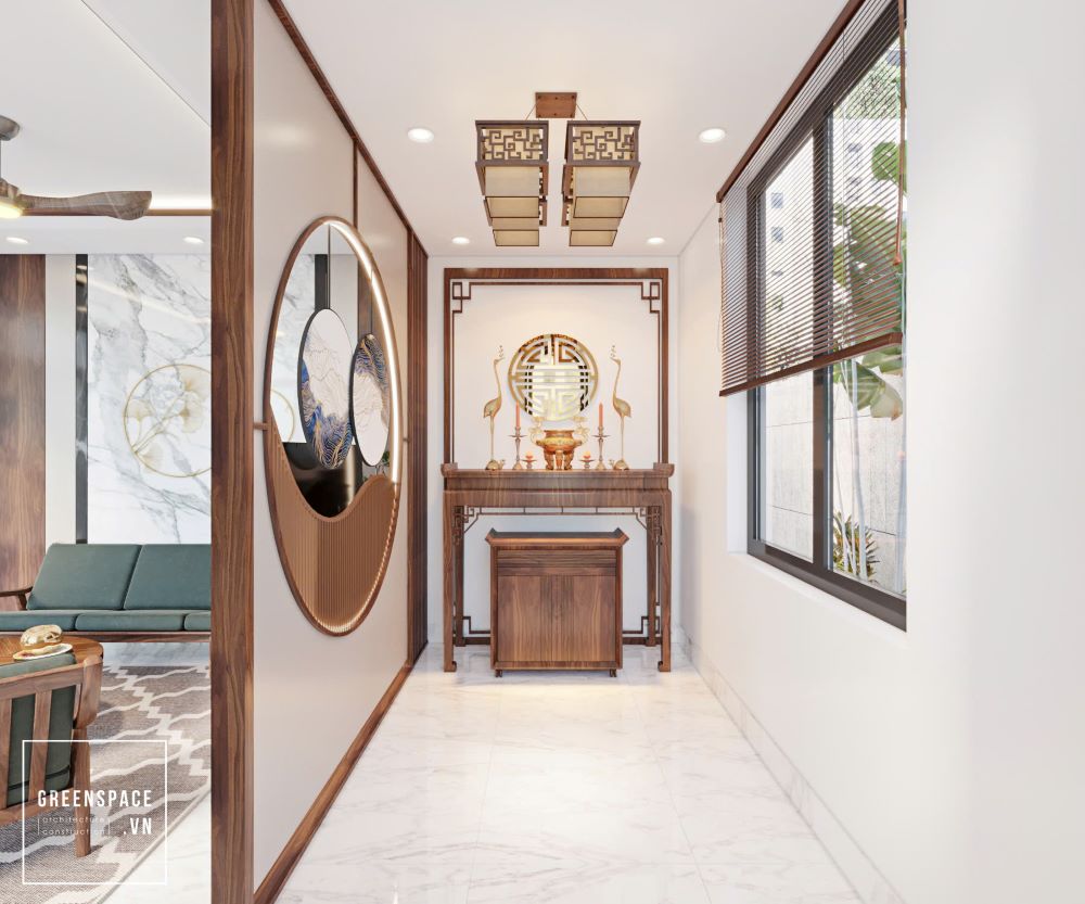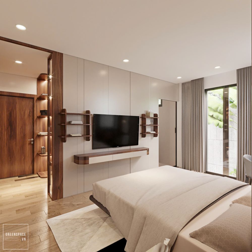 Không gian phòng khách sang trọng với sofa xanh nổi bật. Đèn trần hiện đại tạo điểm nhấn tinh tế. Khu vực thờ trang nghiêm, thiết kế tối giản. Bàn ăn rộng rãi, ghế bọc nỉ êm ái. Bếp hiện đại với gỗ và đá sáng màu. Khu giặt nhỏ gọn, tiện lợi. Phòng ngủ chính tối giản, giường lớn thoải mái. Tủ gỗ âm tường tăng không gian lưu trữ. Phòng thay đồ tiện nghi, ánh sáng chan hòa. Nội thất gỗ kết hợp trắng tạo sự ấm áp. Tivi treo tường tối ưu diện tích. Không gian phòng ngủ phụ vẫn thoáng đãng.