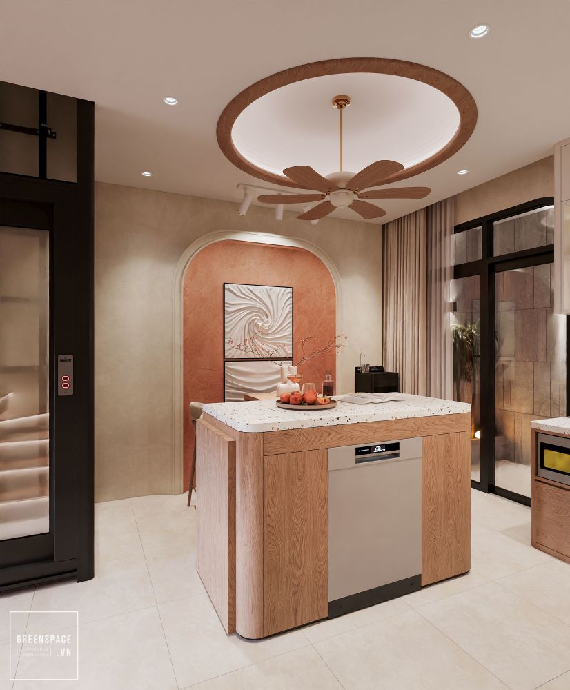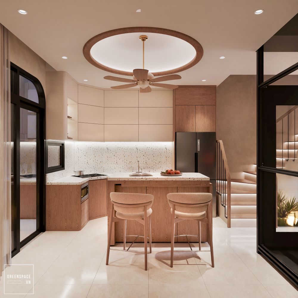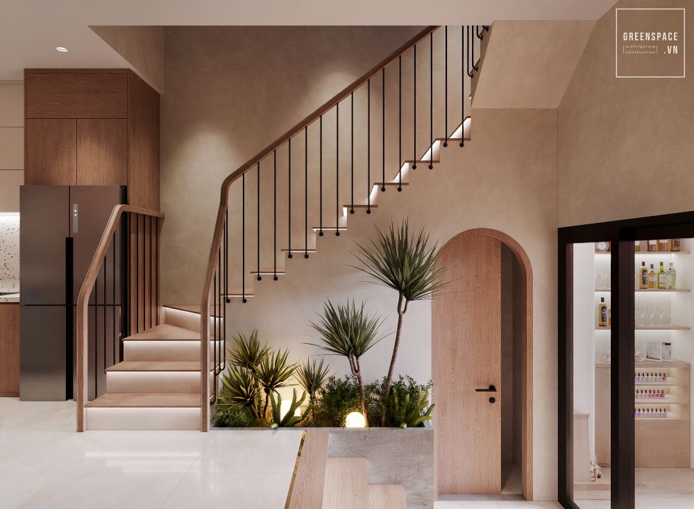Không gian nội thất hiện đại, tông màu gỗ ấm áp. Phòng khách thiết kế tối giản nhưng sang trọng. Ghế sofa sáng màu kết hợp tường cong độc đáo. Khu bếp gọn gàng, đảo bếp tiện nghi. Cầu thang ốp gỗ kết hợp tiểu cảnh xanh mát. Phòng ngủ ấm cúng với ánh sáng dịu nhẹ. Góc ban công bố trí cây xanh thư giãn. Phòng ăn nhỏ gọn kết nối với bếp. Đèn trần thiết kế tròn hài hòa tổng thể. Từng chi tiết thể hiện sự tinh tế và hiện đại.