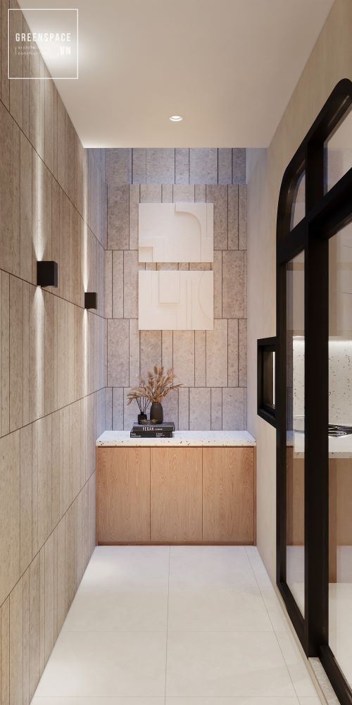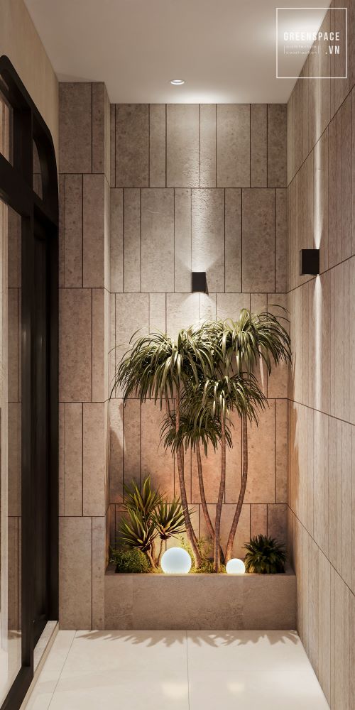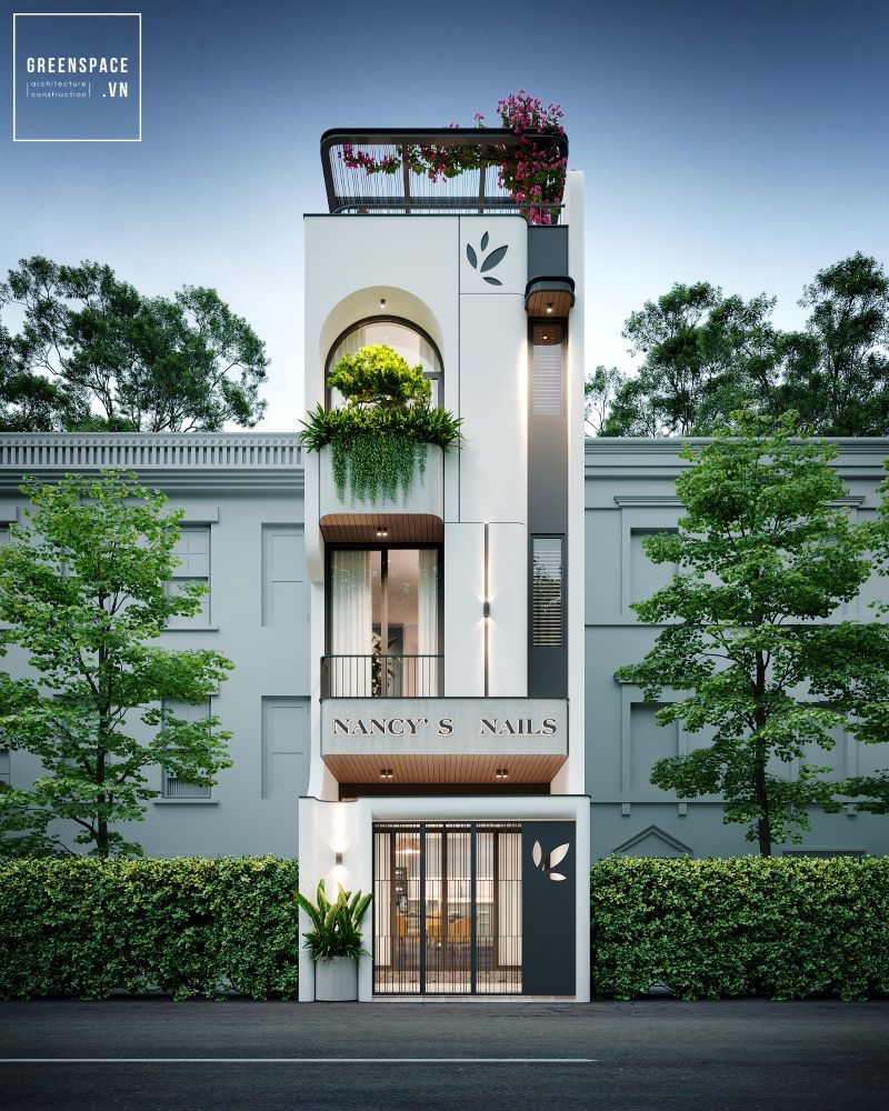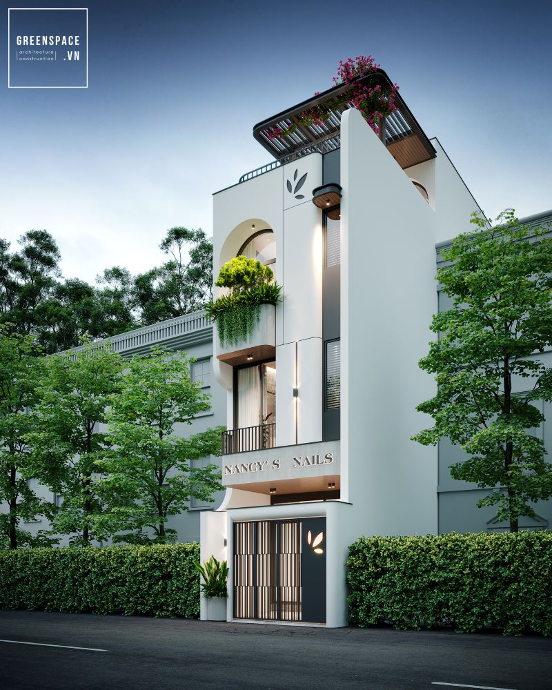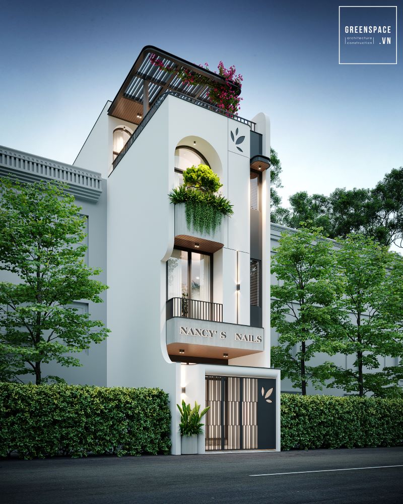 Mặt tiền N’House thiết kế hiện đại tối giản. Màu sắc trung tính tạo cảm giác nhẹ nhàng. Hình khối vuông vắn kết hợp bo tròn mềm mại. Cửa vòm tạo điểm nhấn độc đáo cho mặt tiền. Ban công xanh mát với cây dây leo rủ. Tầng trệt bố trí gara kín đáo và an toàn. Cửa kính lớn mang ánh sáng tự nhiên vào nhà. Tường trắng kết hợp lam gỗ nổi bật tinh tế. Sân thượng rộng rãi lý tưởng để thư giãn. Thiết kế tối ưu không gian sống và thẩm mỹ.