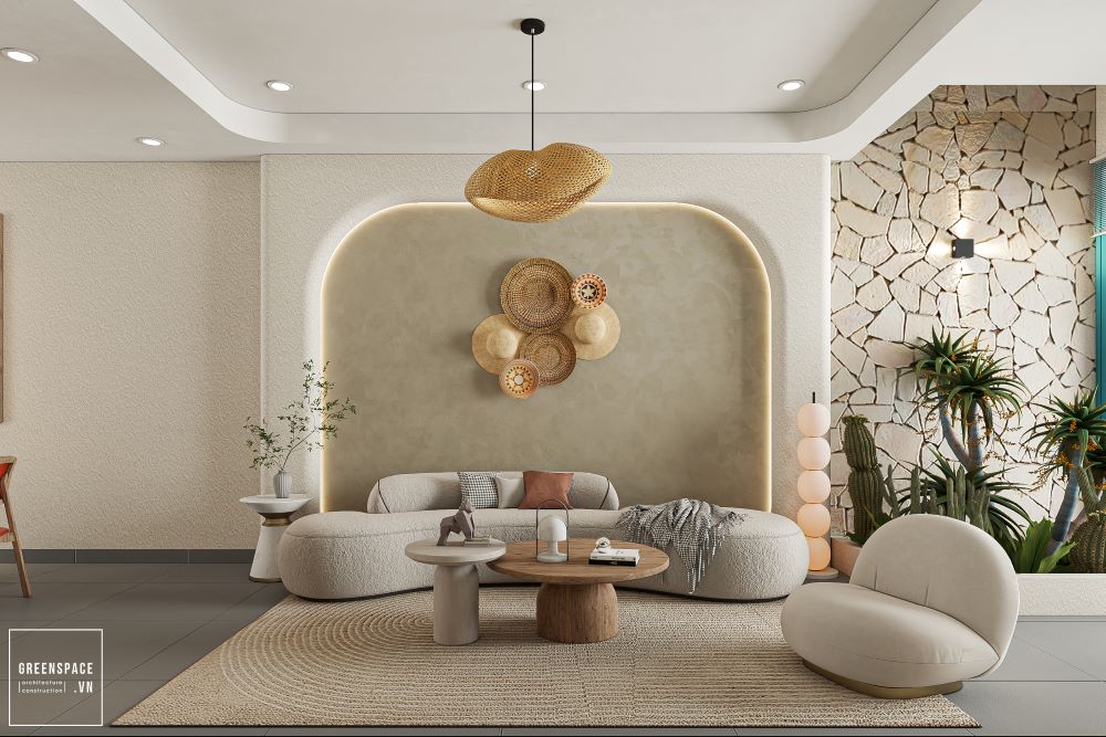• Vật liệu: Gạch, đá tự nhiên, gỗ mộc và sơn trắng giúp tạo cảm giác gần gũi và dễ chịu.