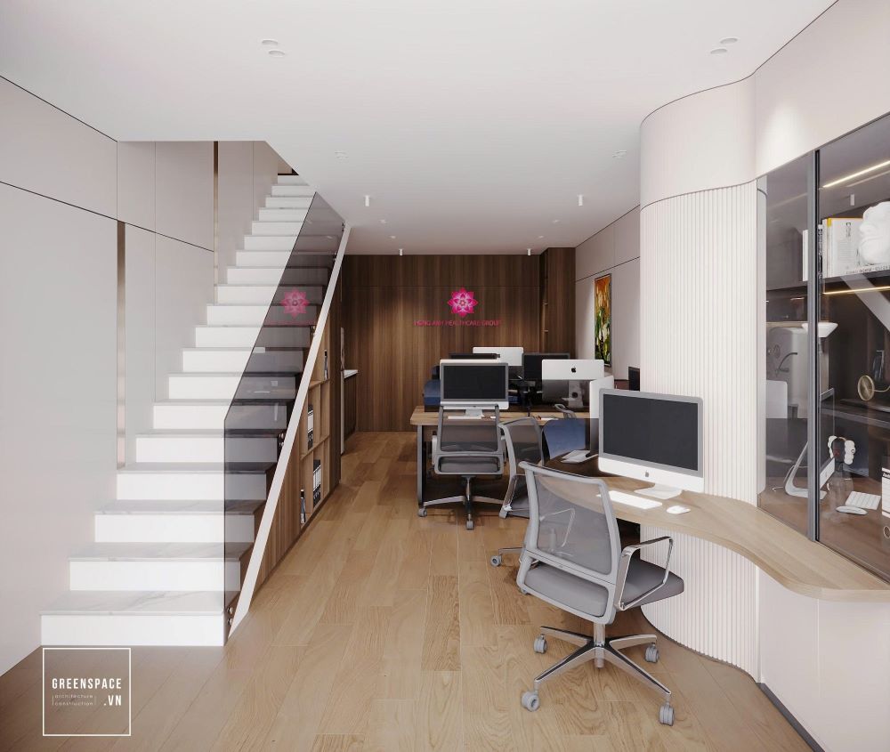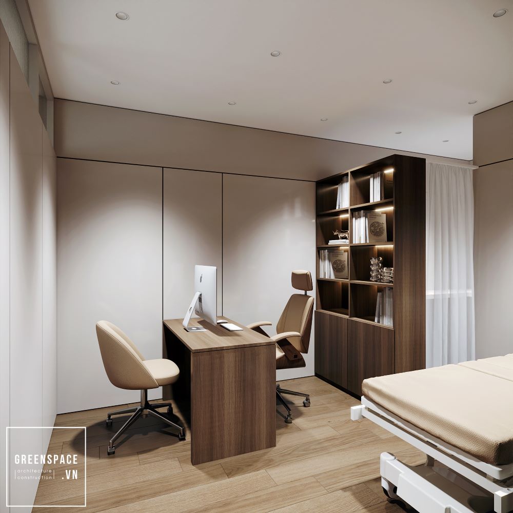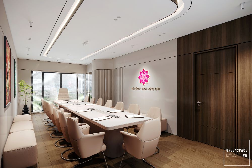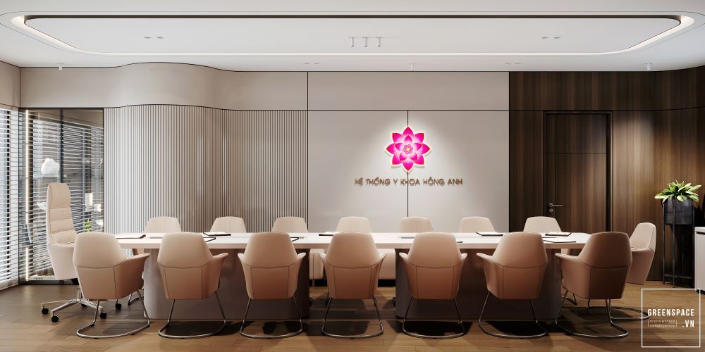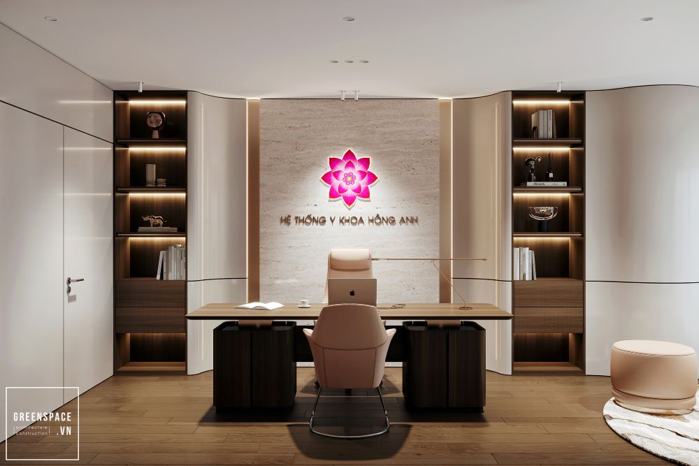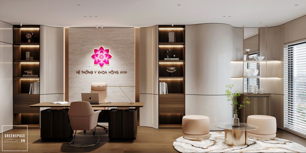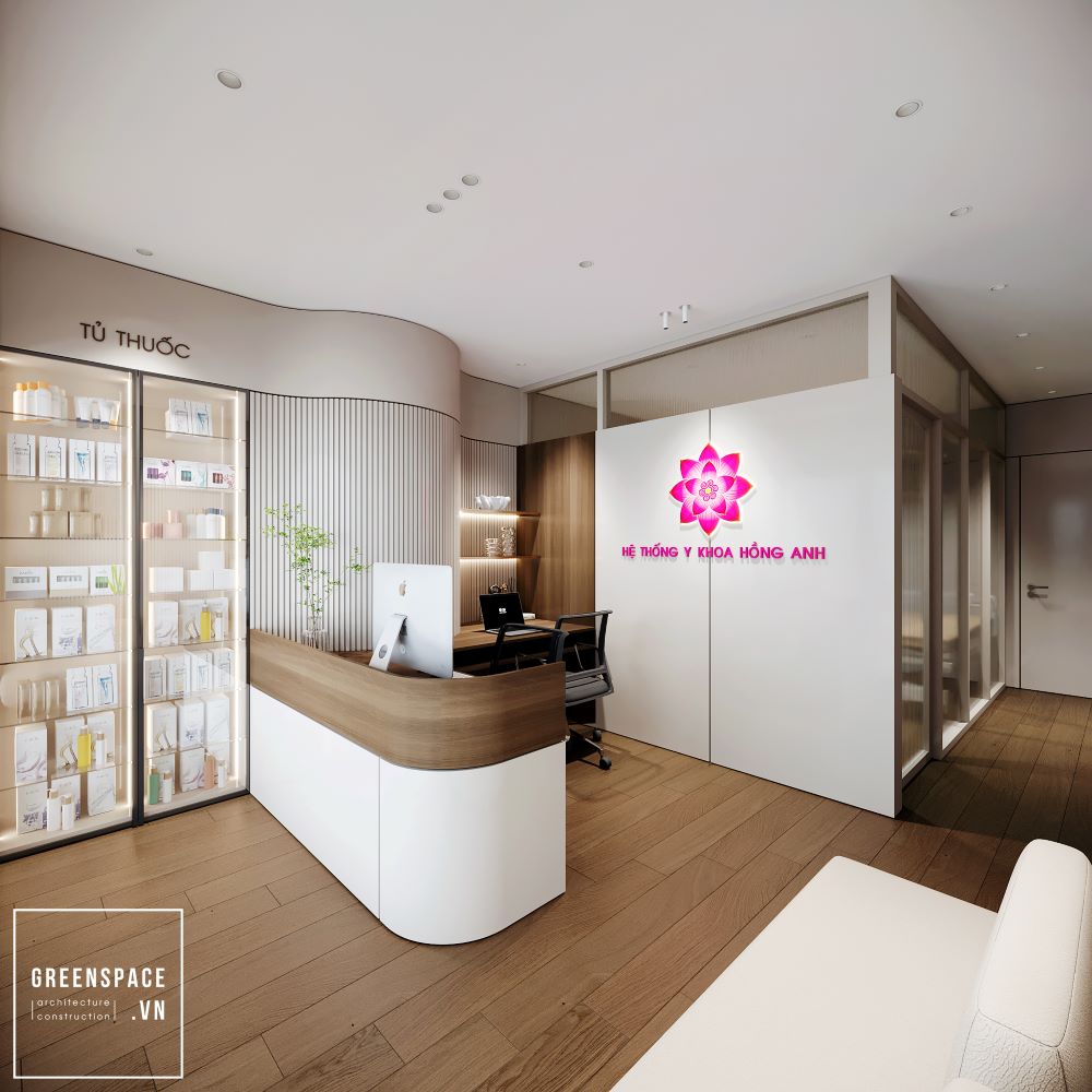 Phòng khám Hồng Anh mang phong cách hiện đại và tinh tế. Không gian được bố trí khoa học, rộng rãi và sáng sủa. Màu sắc chủ đạo là trắng kem kết hợp gỗ tự nhiên. Ánh sáng tự nhiên tràn ngập tạo cảm giác thư giãn. Khu vực lễ tân sang trọng với logo nổi bật. Phòng chờ thoáng đãng, ghế ngồi êm ái và gọn gàng. Khu khám bệnh được ngăn cách bằng kính mờ tinh tế. Nội thất gỗ kết hợp kim loại tạo vẻ chuyên nghiệp. Phòng làm việc của bác sĩ tối giản nhưng ấm cúng. Bàn ghế thiết kế công thái học giúp làm việc thoải mái. Phòng họp trang bị đầy đủ màn hình và bàn dài. Hành lang rộng, kết nối các khu chức năng mạch lạc. Từng chi tiết đều được chăm chút tỉ mỉ và hiện đại. Tổng thể thể hiện đẳng cấp của một phòng khám cao cấp.