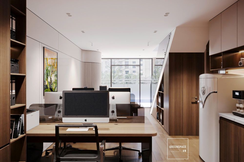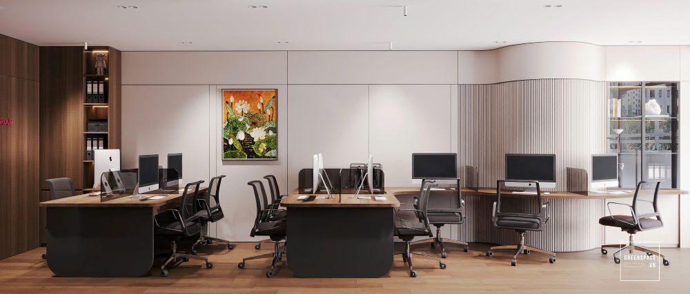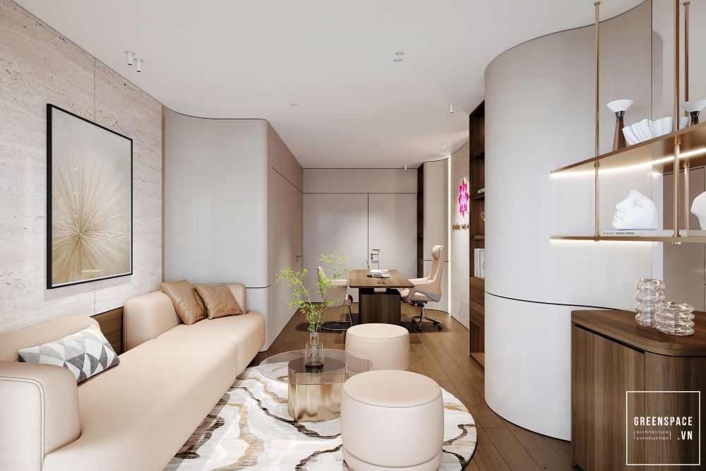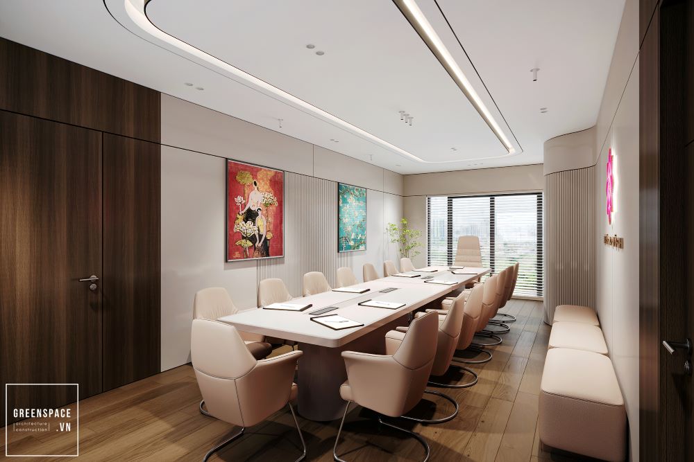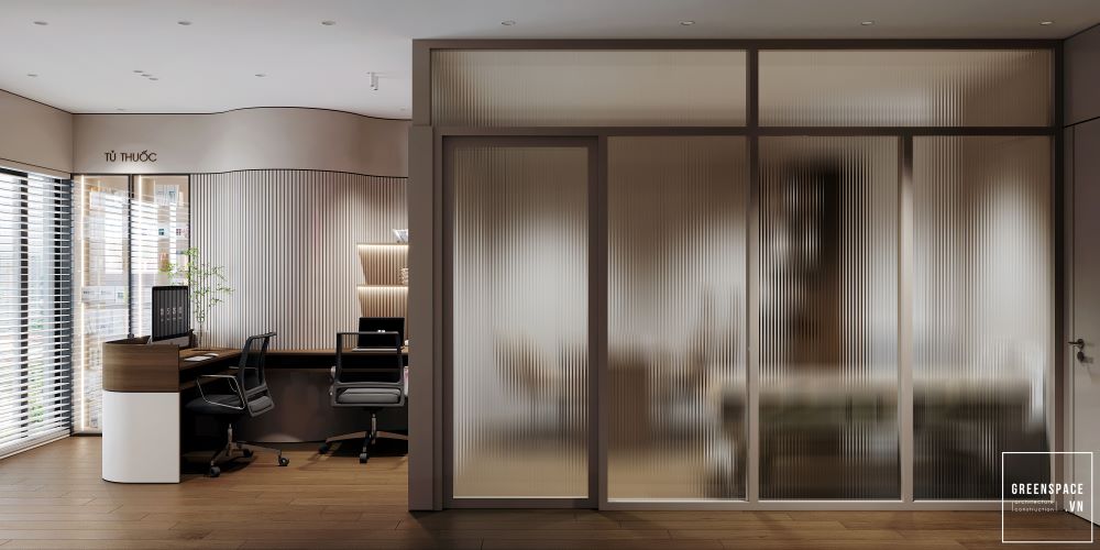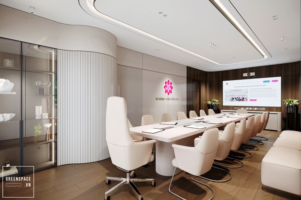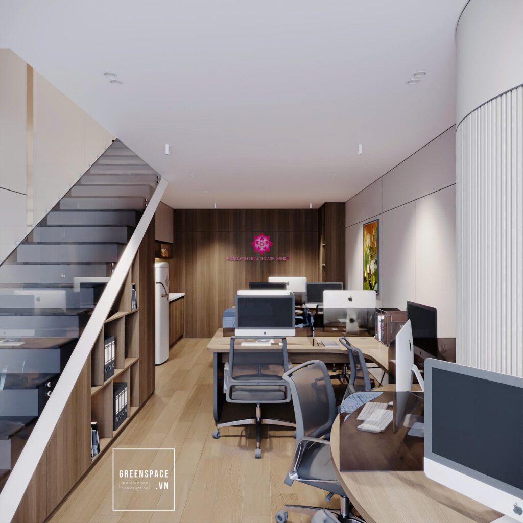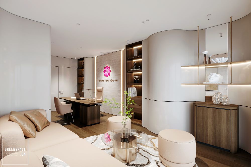 Phòng khám Hồng Anh mang phong cách hiện đại và tinh tế. Không gian được bố trí khoa học, rộng rãi và sáng sủa. Màu sắc chủ đạo là trắng kem kết hợp gỗ tự nhiên. Ánh sáng tự nhiên tràn ngập tạo cảm giác thư giãn. Khu vực lễ tân sang trọng với logo nổi bật. Phòng chờ thoáng đãng, ghế ngồi êm ái và gọn gàng. Khu khám bệnh được ngăn cách bằng kính mờ tinh tế. Nội thất gỗ kết hợp kim loại tạo vẻ chuyên nghiệp. Phòng làm việc của bác sĩ tối giản nhưng ấm cúng. Bàn ghế thiết kế công thái học giúp làm việc thoải mái. Phòng họp trang bị đầy đủ màn hình và bàn dài. Hành lang rộng, kết nối các khu chức năng mạch lạc. Từng chi tiết đều được chăm chút tỉ mỉ và hiện đại. Tổng thể thể hiện đẳng cấp của một phòng khám cao cấp.