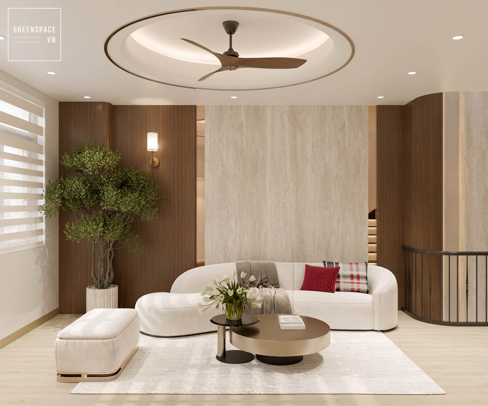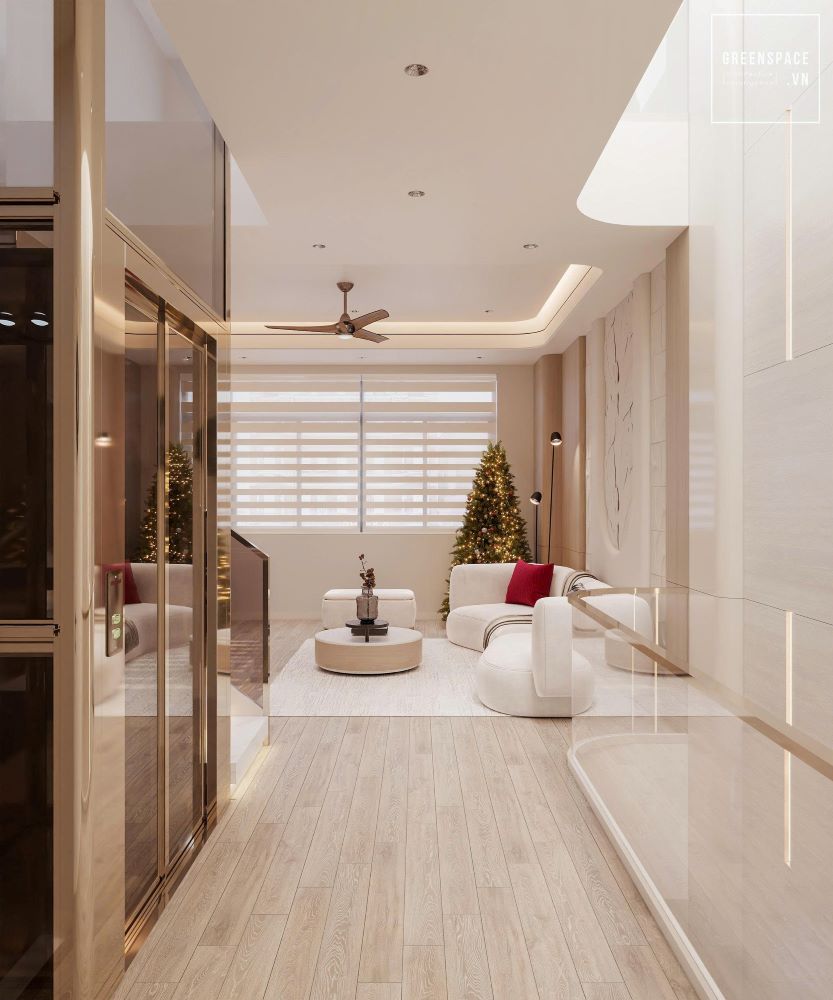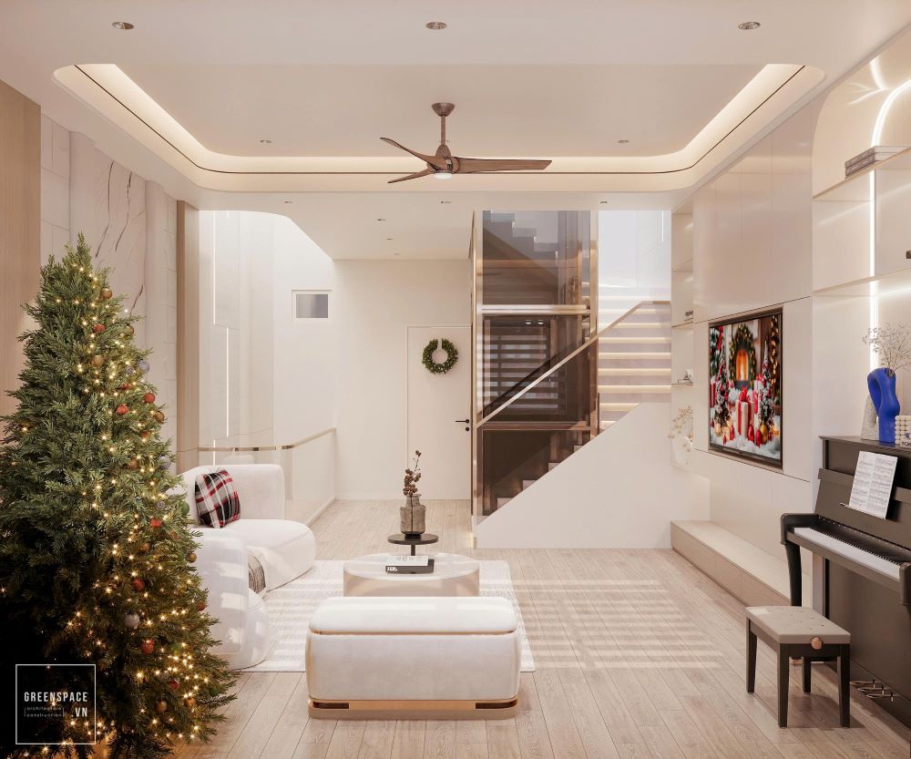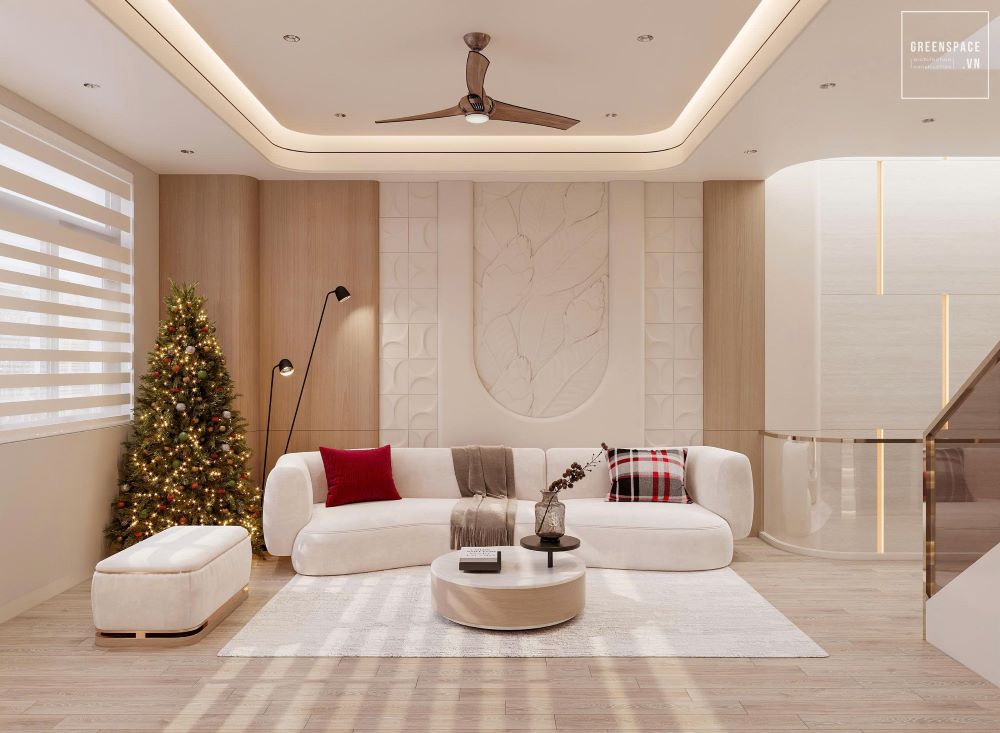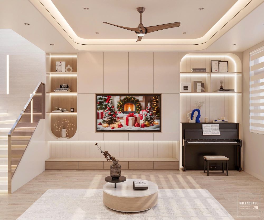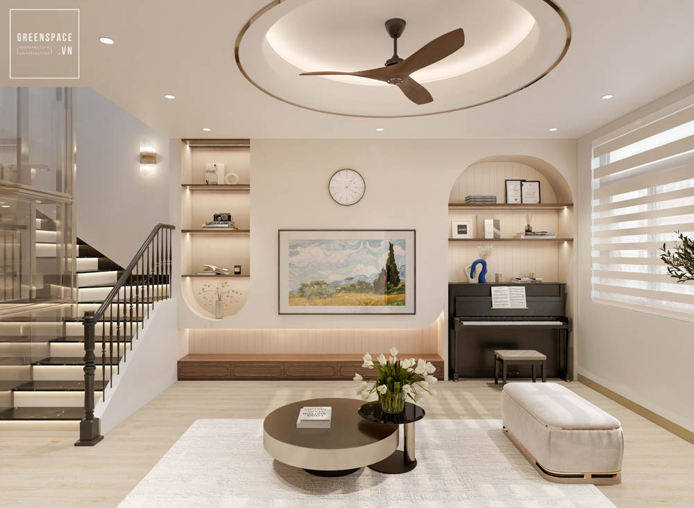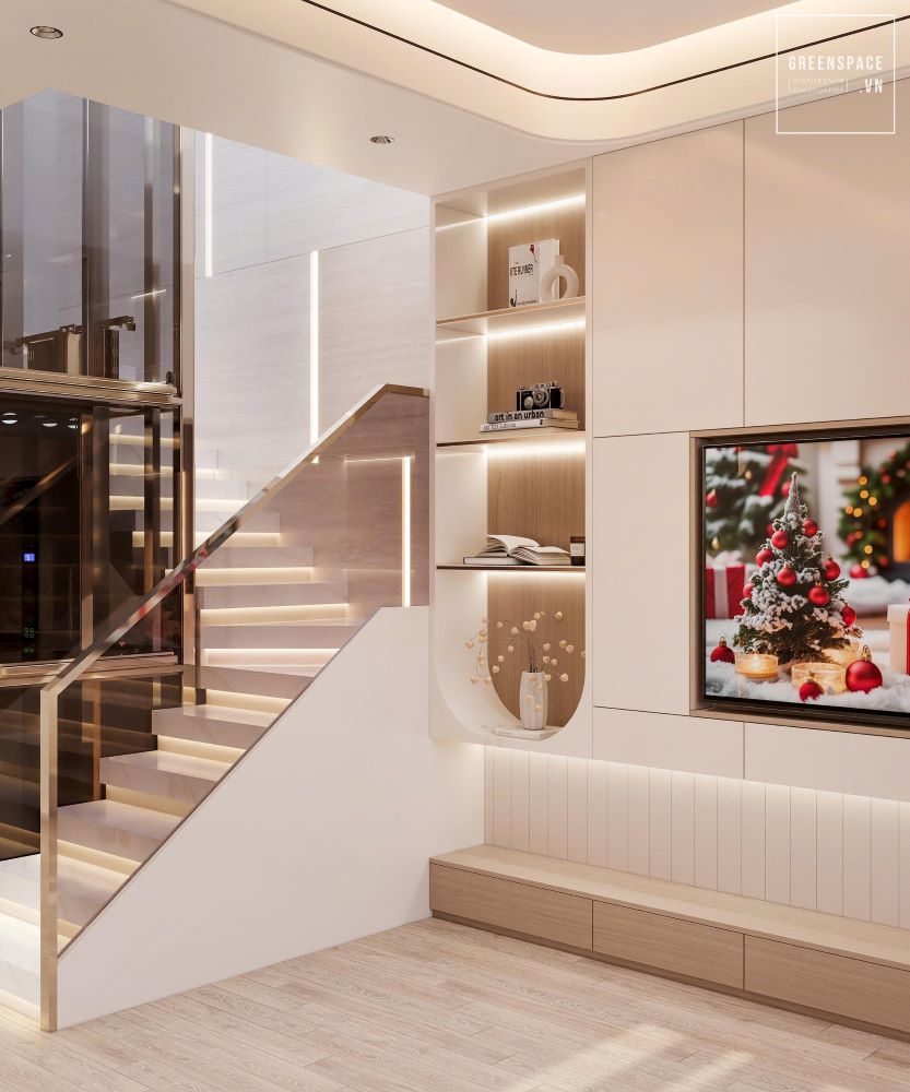 Nội thất V’House mang phong cách hiện đại, gam màu be sáng, tạo cảm giác ấm áp và tinh tế. Không gian mở liên thông phòng khách, bếp và cầu thang giúp ngôi nhà rộng rãi hơn. Hệ tủ âm tường và kệ trang trí bo cong tăng tính gọn gàng, sang trọng. Ánh sáng tự nhiên kết hợp đèn hắt trần làm nổi bật vật liệu và chi tiết nội thất. Sofa dáng thấp, bàn trà tròn và thảm trung tính tạo điểm nhấn nhẹ nhàng. Thiết kế cầu thang kính và lan can mảnh giúp tổng thể thanh thoát, hiện đại.