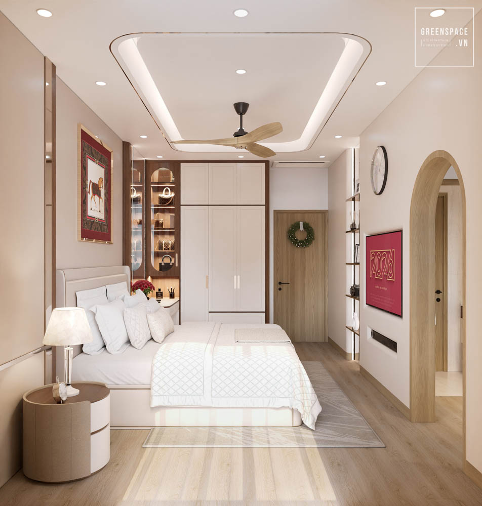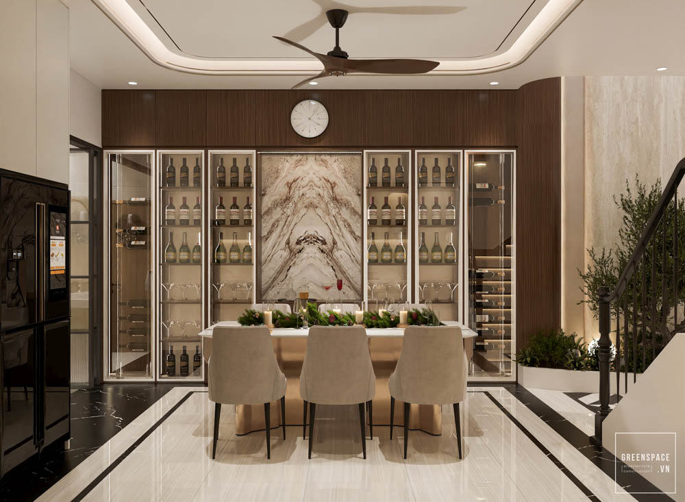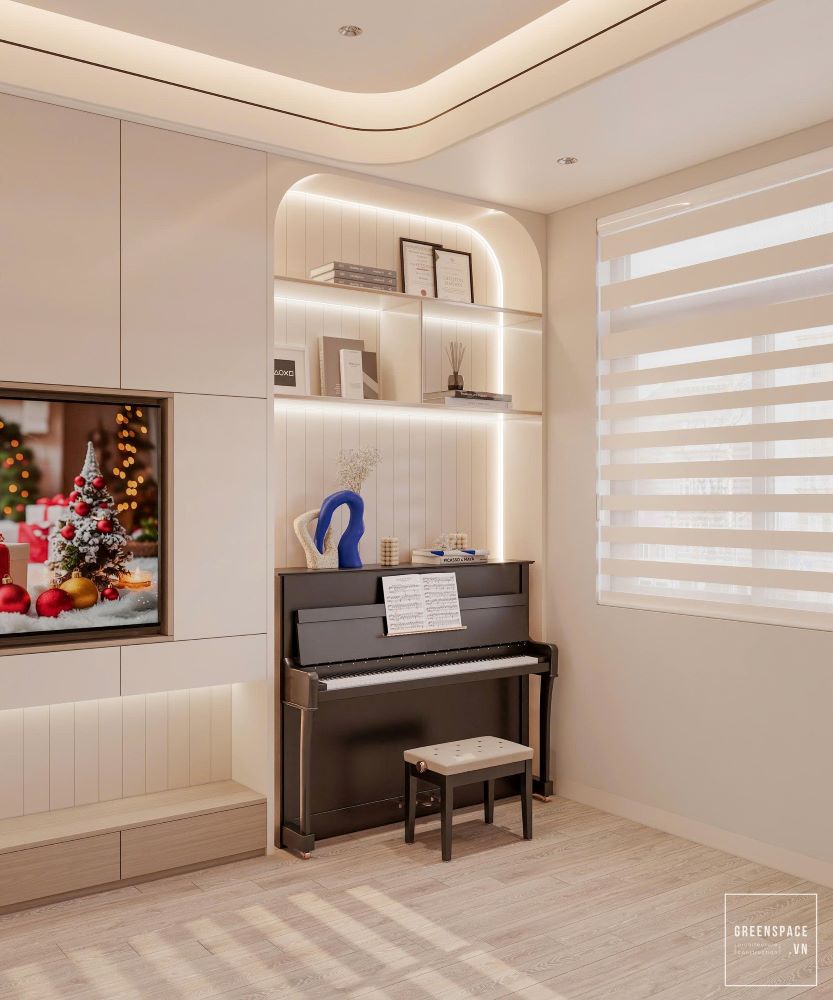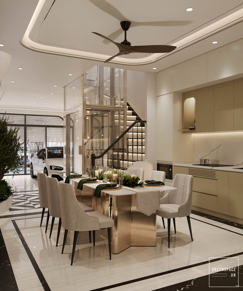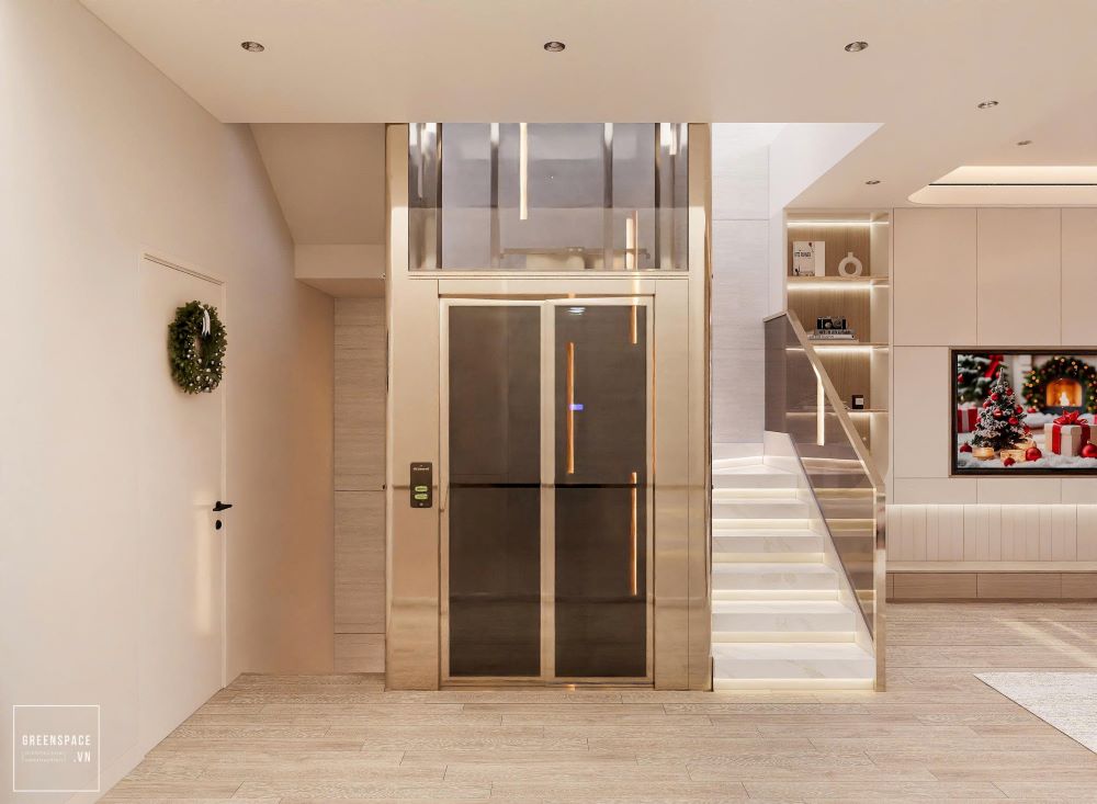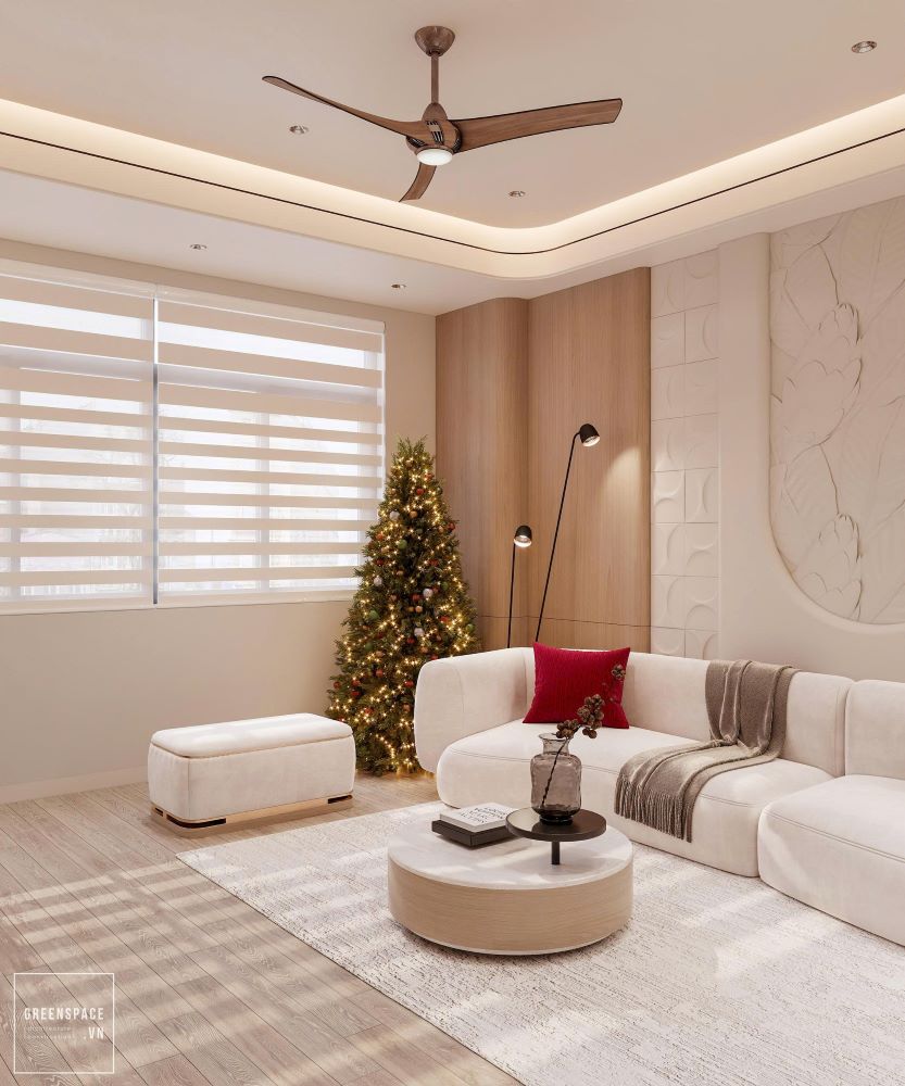 Nội thất V’House mang phong cách hiện đại, gam màu be sáng, tạo cảm giác ấm áp và tinh tế. Không gian mở liên thông phòng khách, bếp và cầu thang giúp ngôi nhà rộng rãi hơn. Hệ tủ âm tường và kệ trang trí bo cong tăng tính gọn gàng, sang trọng. Ánh sáng tự nhiên kết hợp đèn hắt trần làm nổi bật vật liệu và chi tiết nội thất. Sofa dáng thấp, bàn trà tròn và thảm trung tính tạo điểm nhấn nhẹ nhàng. Thiết kế cầu thang kính và lan can mảnh giúp tổng thể thanh thoát, hiện đại.