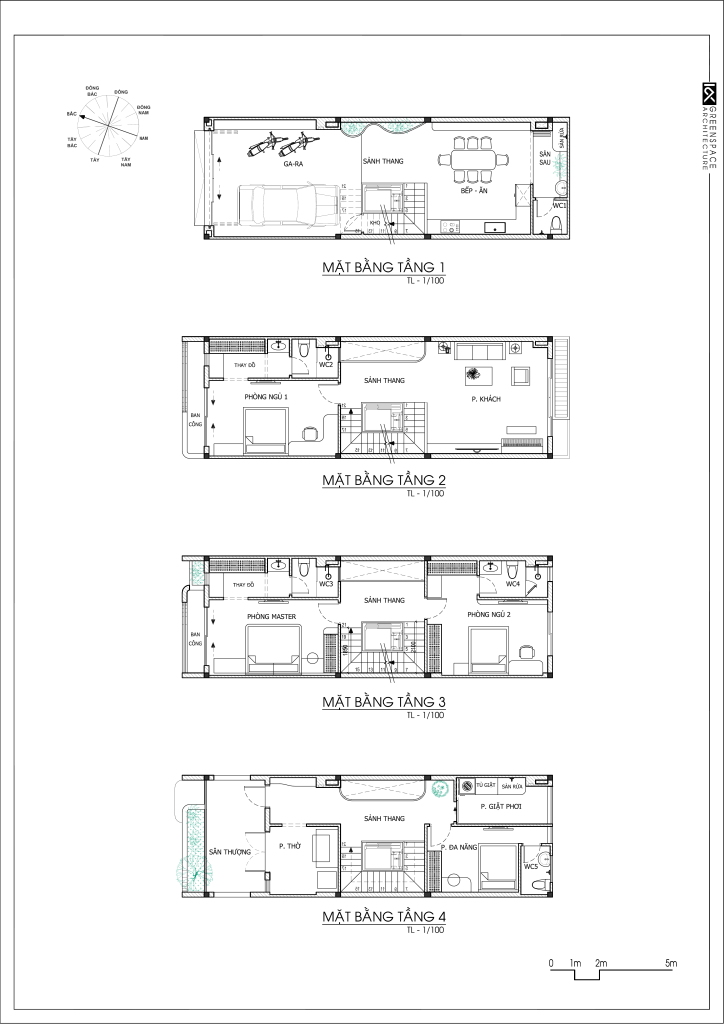 Mặt bằng tầng một bố trí gara phía trước kết nối trực tiếp sảnh thang trung tâm nhà gọn gàng. Không gian bếp và ăn đặt cuối nhà mở ra sân sau thoáng sáng tự nhiên tiện nghi hiện đại. Tầng hai và ba sắp xếp phòng ngủ quanh lõi thang đảm bảo riêng tư tối đa cho gia đình. Tầng bốn gồm phòng thờ phía trước và sân thượng sau kết hợp giặt phơi linh hoạt bốn mùa .