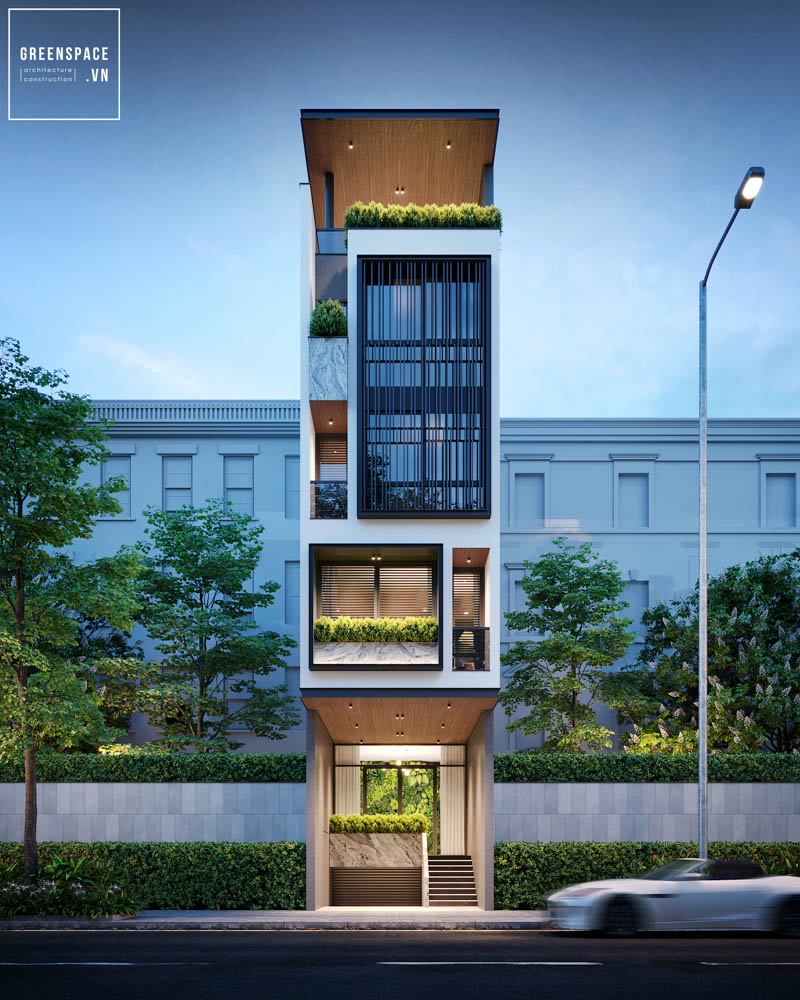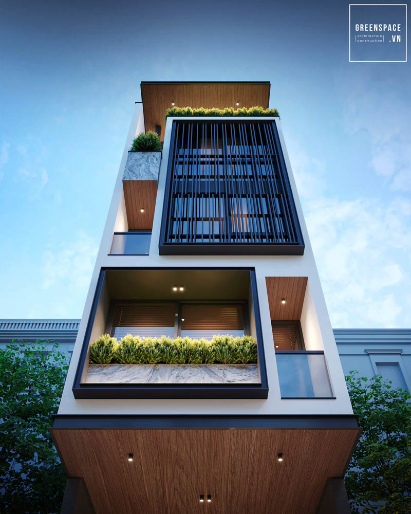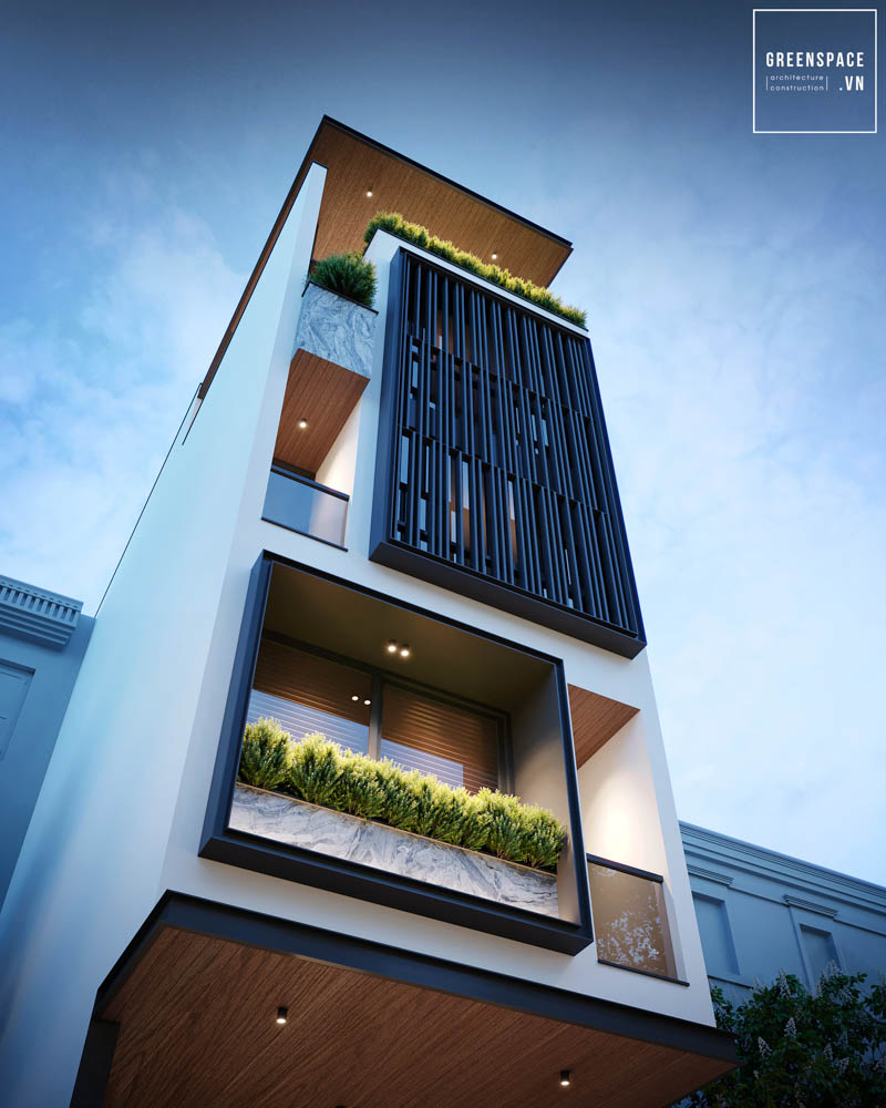 Mặt tiền nhà phố tạo hình khối đứng mạnh mẽ, nhấn cao độ và tỷ lệ gọn gàng trên lô đất hẹp. Ngôn ngữ kiến trúc hiện đại thể hiện qua mảng đặc rỗng rõ ràng và đường nét tối giản. Lam đứng kim loại vừa che nắng vừa tạo điểm nhấn thị giác cho mặt đứng. Ban công xanh được bố trí xen kẽ giúp công trình mềm mại và cải thiện vi khí hậu đô thị. Mái vươn lệch kết hợp trần gỗ tạo cảm giác nhẹ nhàng và tăng chiều sâu không gian. Tổng thể công trình hài hòa cảnh quan xung quanh, thể hiện tinh thần nhà phố hiện đại bền vững.