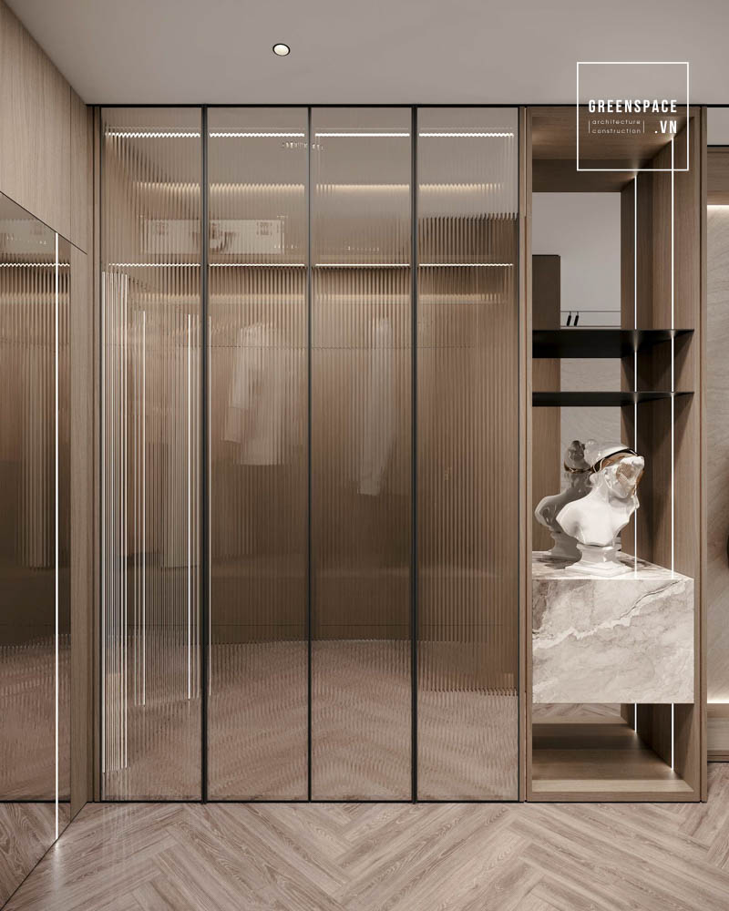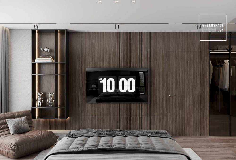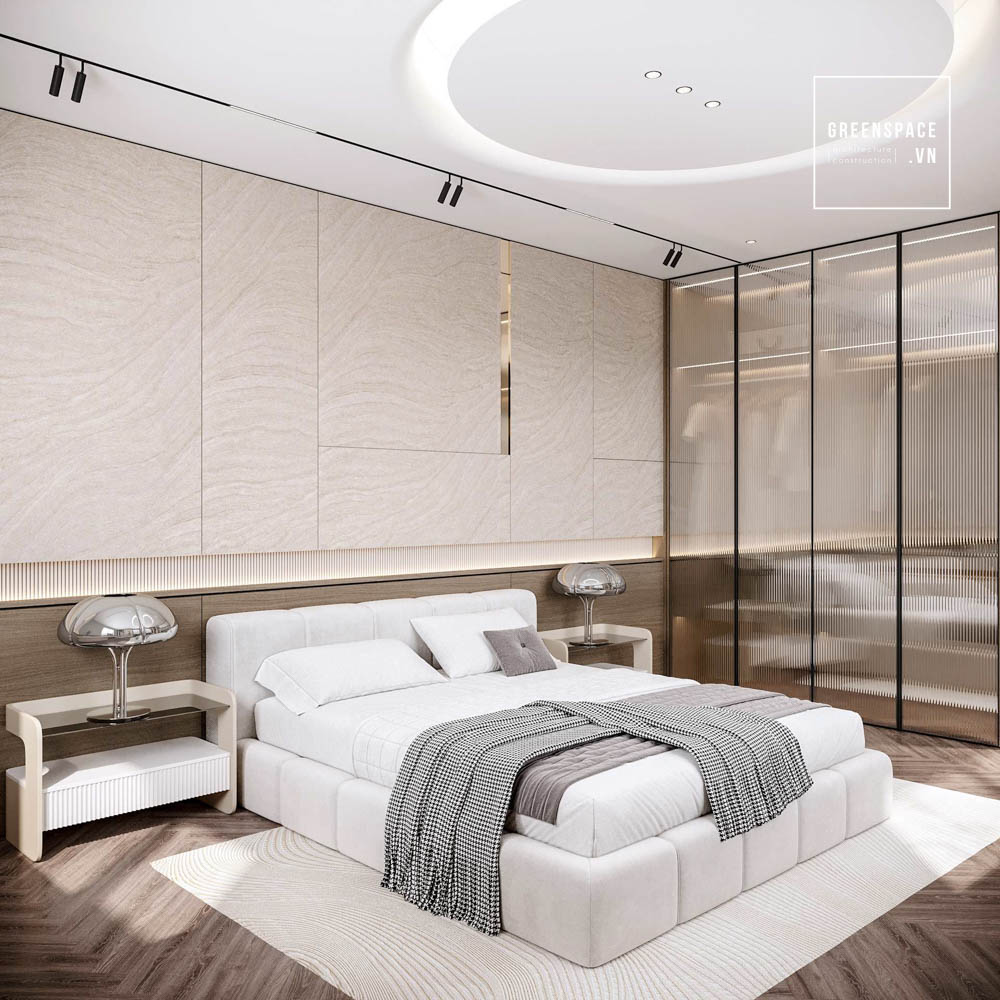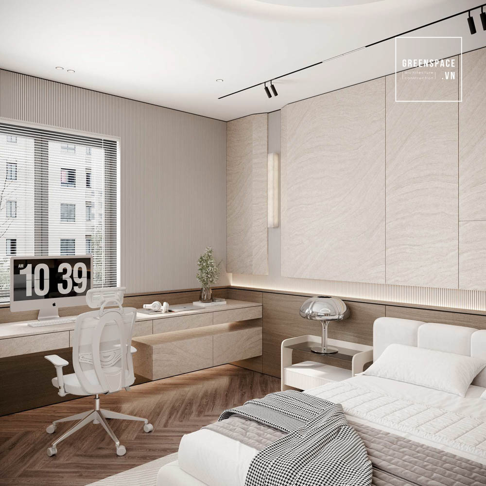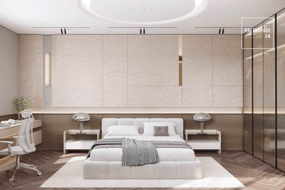Không gian nội thất phòng ngủ mang phong cách hiện đại, gam màu trung tính tạo cảm giác sang trọng và thư giãn. Bố cục không gian mạch lạc, phân tách rõ khu nghỉ ngơi, làm việc và lưu trữ. Chất liệu gỗ kết hợp đá và kính giúp tổng thể hài hòa, ấm áp nhưng vẫn tinh tế. Hệ tủ âm tường và vách trang trí tối ưu diện tích sử dụng hiệu quả. Ánh sáng tự nhiên được khai thác tốt, kết hợp đèn chiếu sáng tạo chiều sâu không gian.