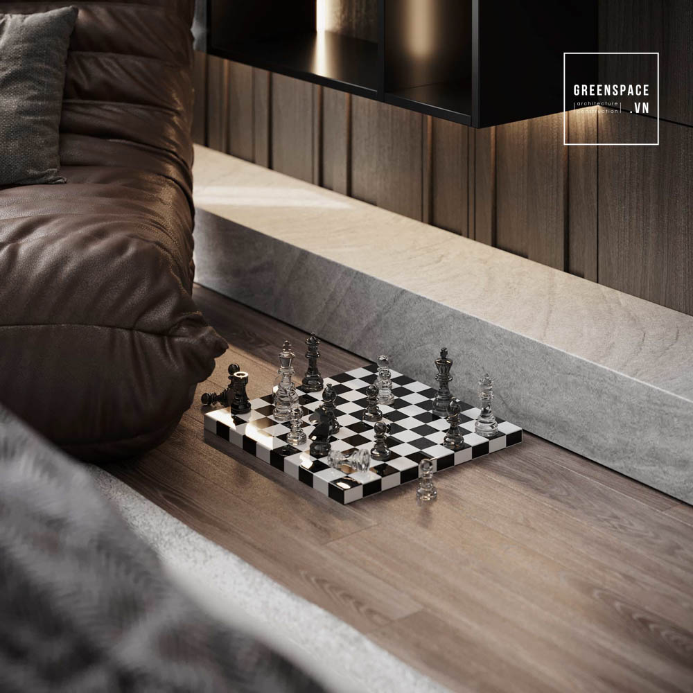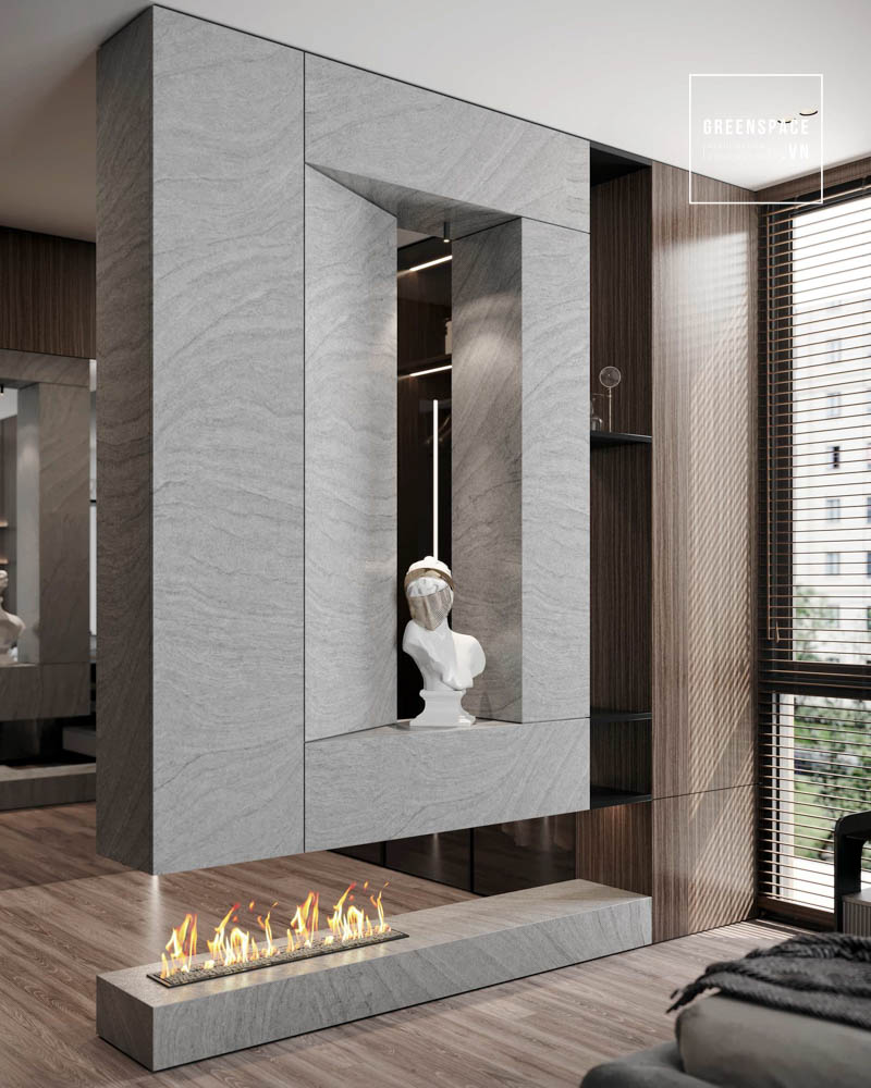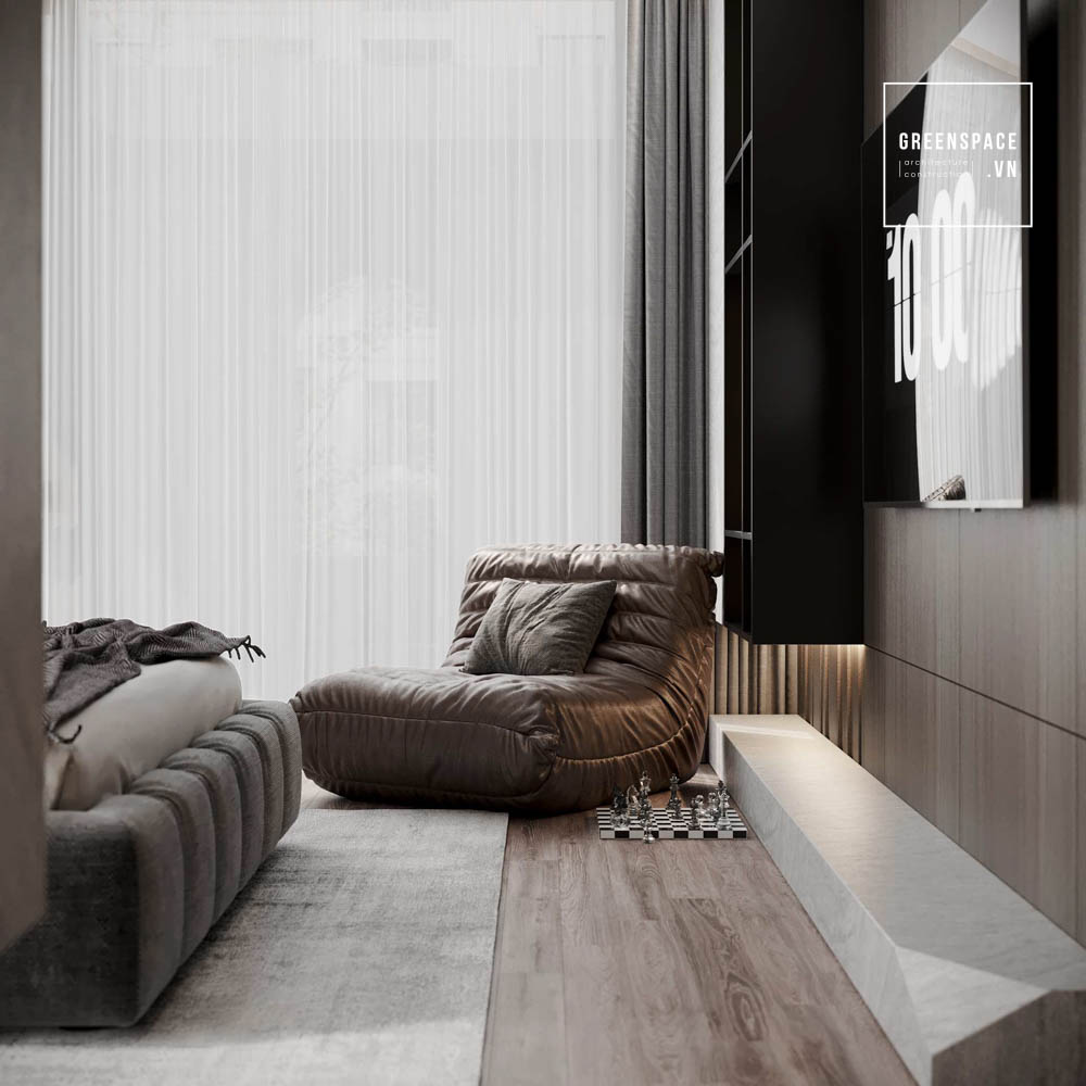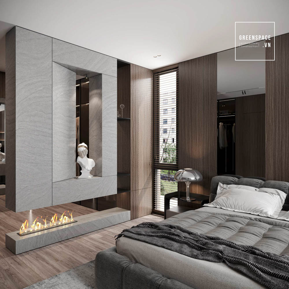 Không gian nội thất phòng ngủ mang phong cách hiện đại, gam màu trung tính tạo cảm giác sang trọng và thư giãn. Bố cục không gian mạch lạc, phân tách rõ khu nghỉ ngơi, làm việc và lưu trữ. Chất liệu gỗ kết hợp đá và kính giúp tổng thể hài hòa, ấm áp nhưng vẫn tinh tế. Hệ tủ âm tường và vách trang trí tối ưu diện tích sử dụng hiệu quả. Ánh sáng tự nhiên được khai thác tốt, kết hợp đèn chiếu sáng tạo chiều sâu không gian.