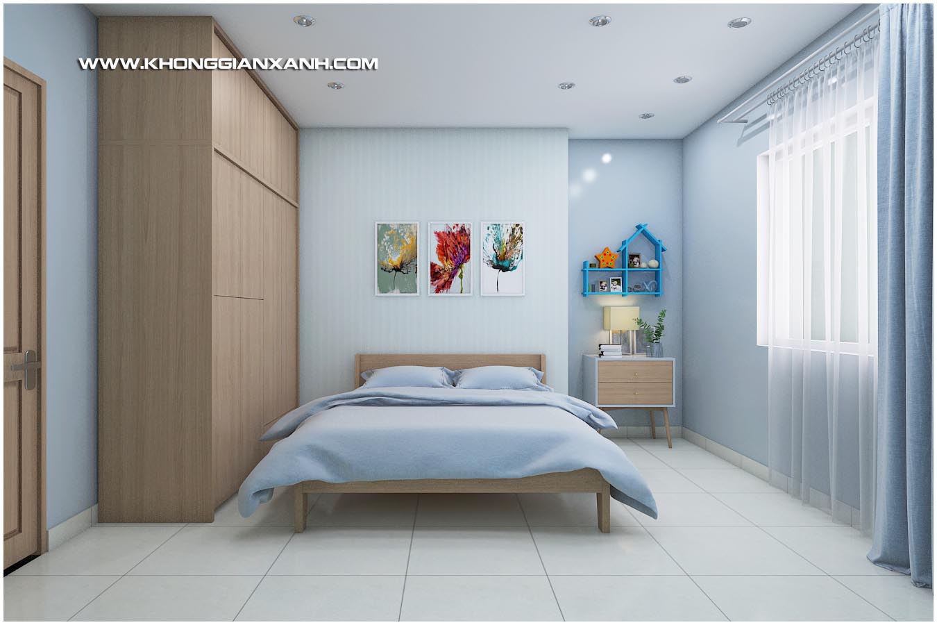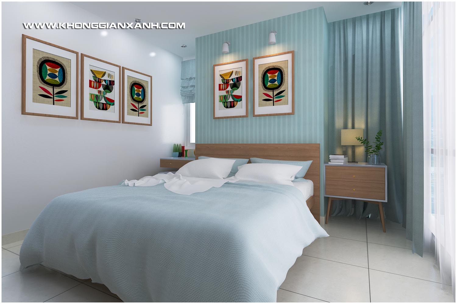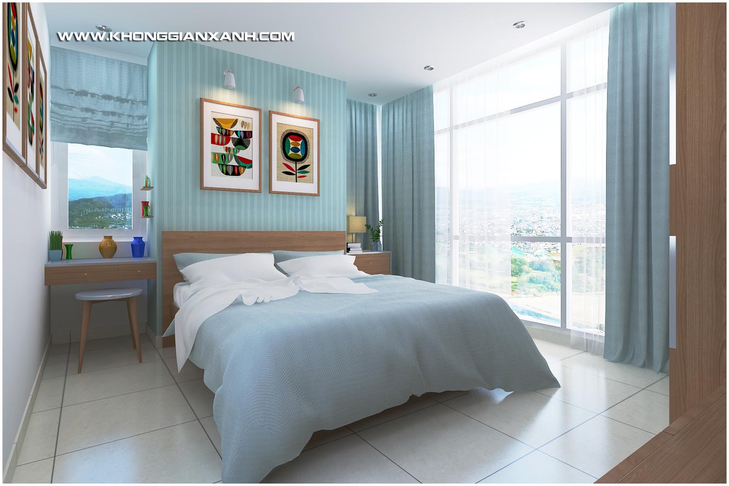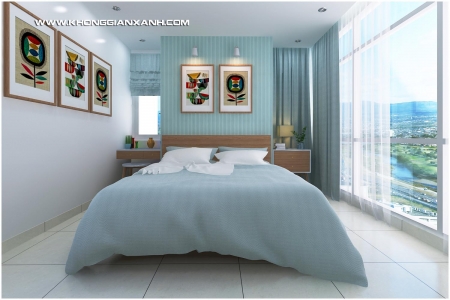 Các không gian ngủ sủ dụng các ton màu sinh động tạo vẻ an nhiên trong không gian sống và tận dụng tối đa các view của từng phòng ra các không gian bên ngoài chung cư.