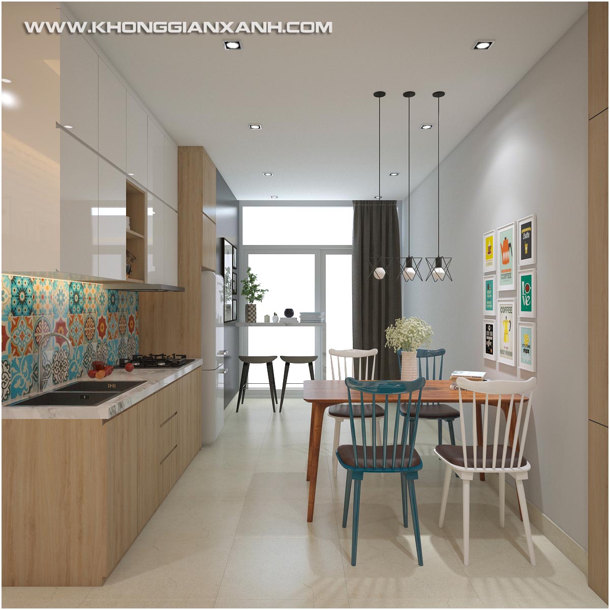 Bộ bàn ăn nhỏ gọn, pha phối màu hài hòa cùng gian bếp sử dụng gạch hoa văn ốp vách