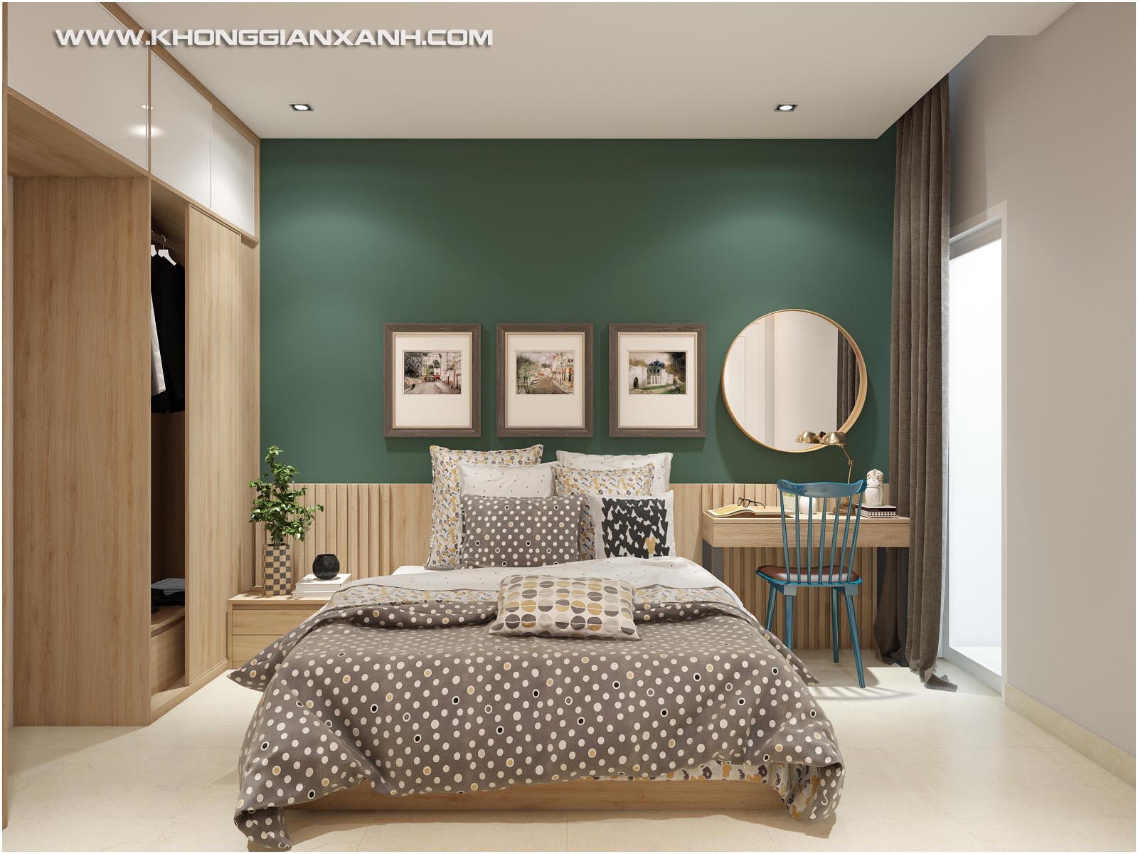 Ton màu nhấn đầu giường kết hợp cùng màu sắc ga trải giường, rèm ngủ trở thành 1 bản phối màu hài hòa và đa sắc