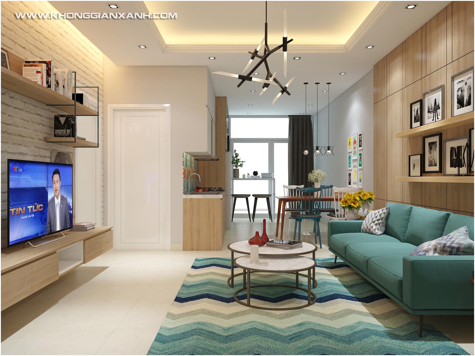 Sofa xanh, nổi bật nhưng hài hòa trên vách ốp gỗ sậm màu, bạn có nghỉ đây là 1 góc phòng khách chung cư? hay một góc trong studio ảnh?