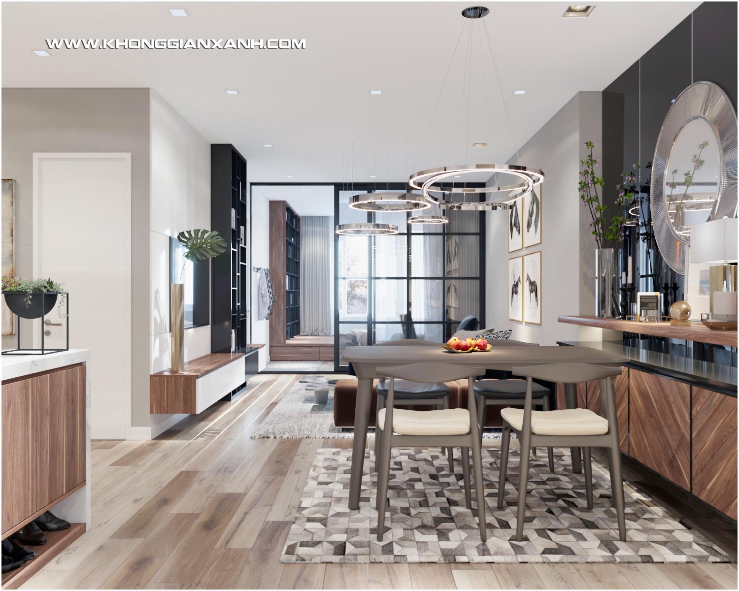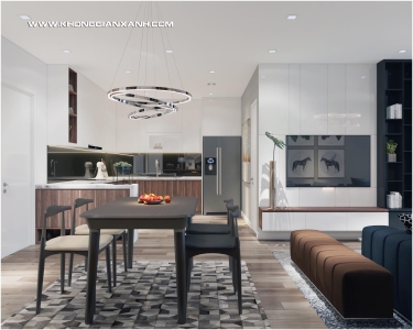 Nhược đểm của căn hộ khi không gian phòng khách bị ngăn cách với không gian cửa sổ hướng ra bên ngoài bởi 1 phòng ngủ được các kiến trúc sư của Kiến trúc Không Gian Xanh giải quyết bằng 1 vách kính lấy sáng xuyên phòng kế hợp hệ màn cửa. Thiết kế này giúp linh động trong việc sử dụng không gian cũng như làm tăn tính thẩm mỹ cho căn hộ mà trước đó vốn bị bó hẹp không gian bởi các vách tường.