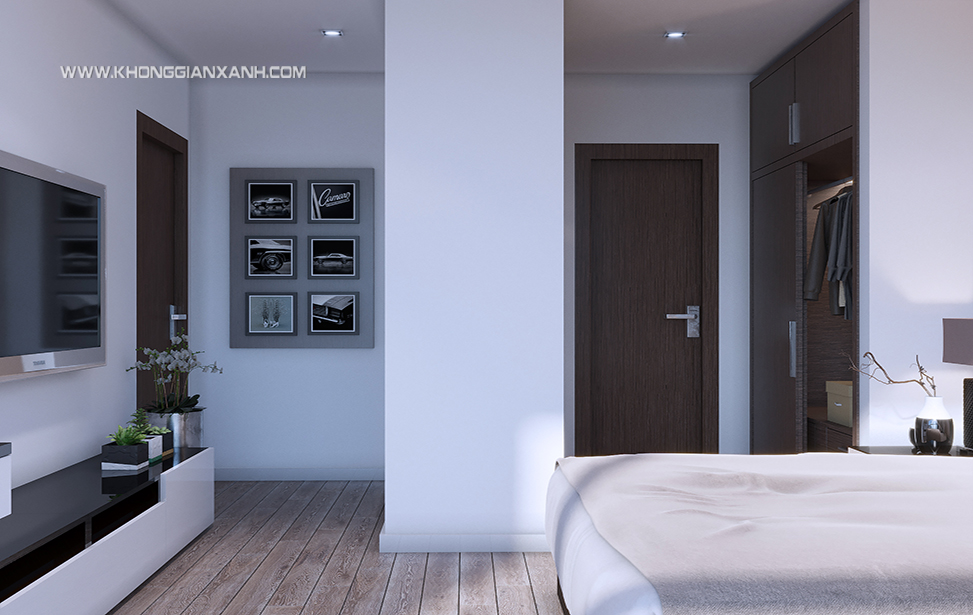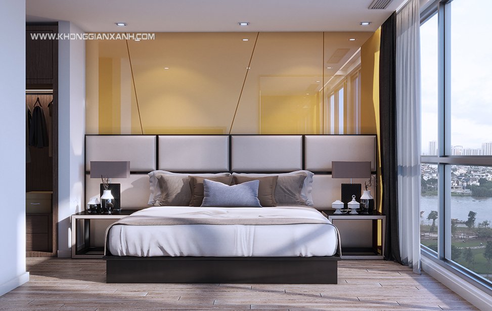 Thiết kế phòng ngủ Master sang trọng, tone màu nhẹ nhàng giúp gia chủ có thể thư giản, thoải mái,vách trang trí đầu giường được sử dụng vật liệu acrylic màu vàng giúp tôn lên vẻ sang trọng, lịch lãm của căn phòng và phù hợp gia chủ mệnh kim.