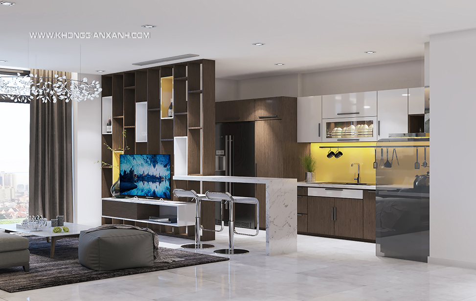Phòng khách được ngăn cách với phòng bếp bởi vách ngăn bằng gỗ kết hợp với quầy bar mini tiết kiệm không gian và tạo điểm nhấn cho căn hộ.