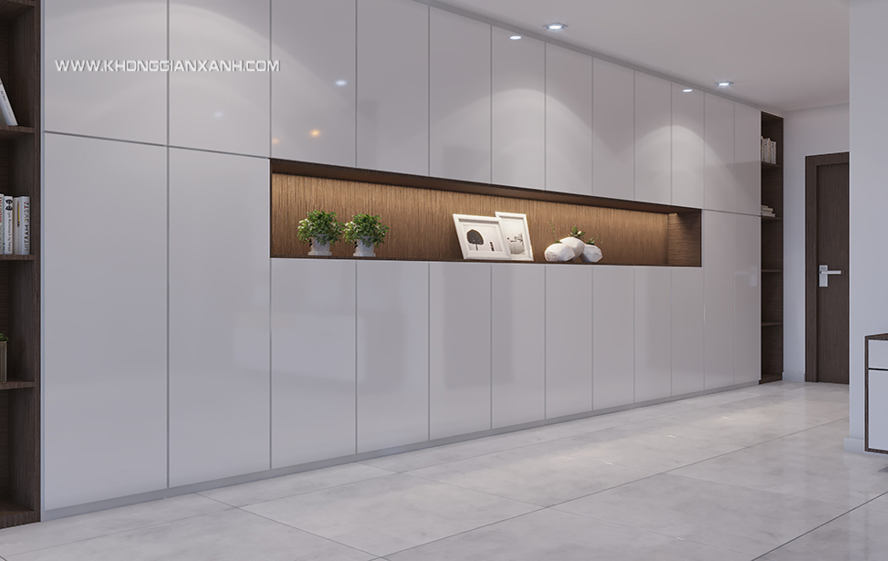 Kệ trang trí kết hợp với tủ giày được đặt ngay cửa ra vào tạo nên nét đặc sắc và tiện lợi cho căn hộ.