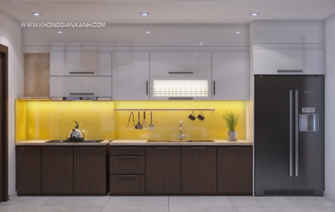 Tủ bếp được sử dụng gỗ công nghiệp kết hợp với vật liệu acrylic tạo nên nét tinh tế và sang trọng hơn cho không gian bếp