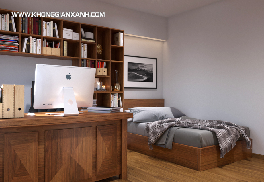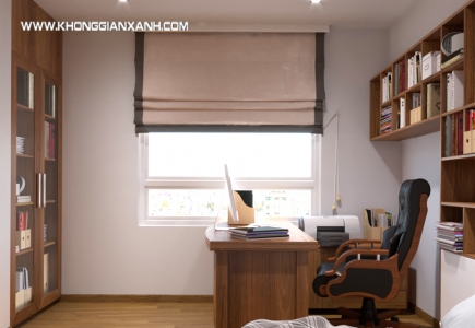 Gia chủ dành hẳn một không gian riêng để làm việc, nội thất của căn phòng đơn giản chỉ gồm những vật dụng cần thiết là bàn, ghế, kệ sách, tủ chứa hồ sơ và những giấy tờ cần thiết và giường để gia chủ có thể nghỉ ngơi, tất cả đều được làm bằng gỗ công nghiệp. Bàn làm việc được đặt gần cửa sổ để lấy ánh sáng tự nhiên, tạo cảm giác thoải mái, có thể nhìn ngắm khung cảnh bên ngoài giúp giảm sự căng thẳng và đem lại hiệu quả công việc cao.