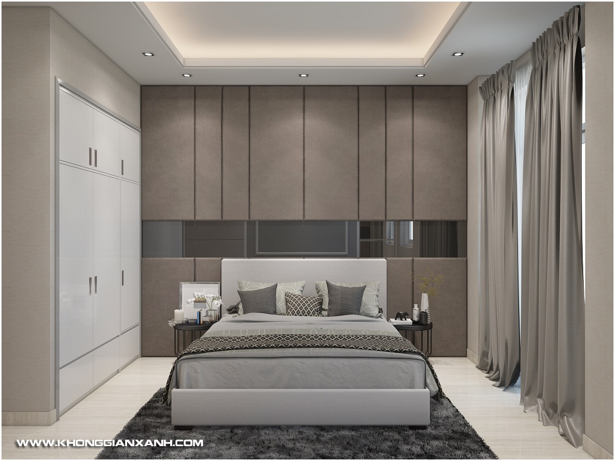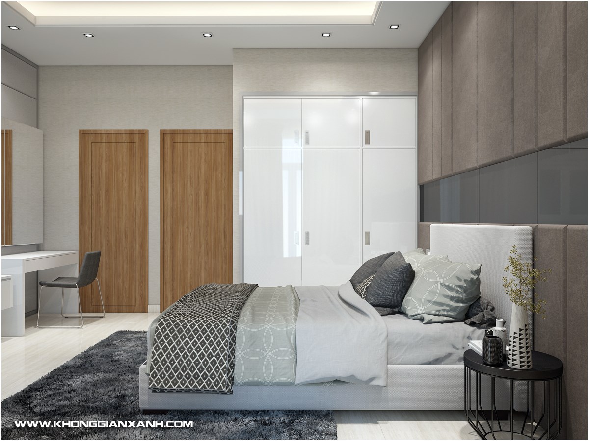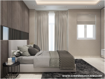 Khu vực phòng ngủ lại là một không gian với ton trầm dịu nhẹ giúp giấc ngủ gia chủ thêm thư thái. Các chất liệu bọc nỉ được đưa vào thiết kế khiến căn phòng như mềm mại hơn và thân thiện hơn