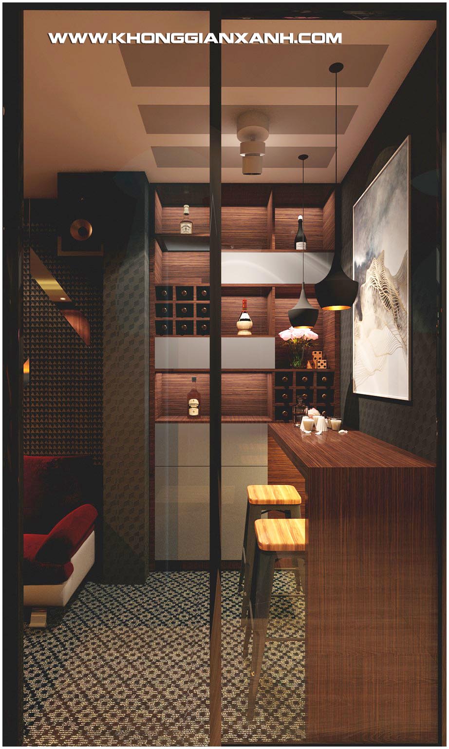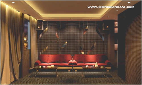 Khu vực phòng karaoke được thiết kế ấm cúng và sang trọng với ton màu đỏ và đen, pha phối cùng hệ thống tủ rượu được nhấn mạnh các mảng khối bằng hệ thống đèn led chiếu sáng.