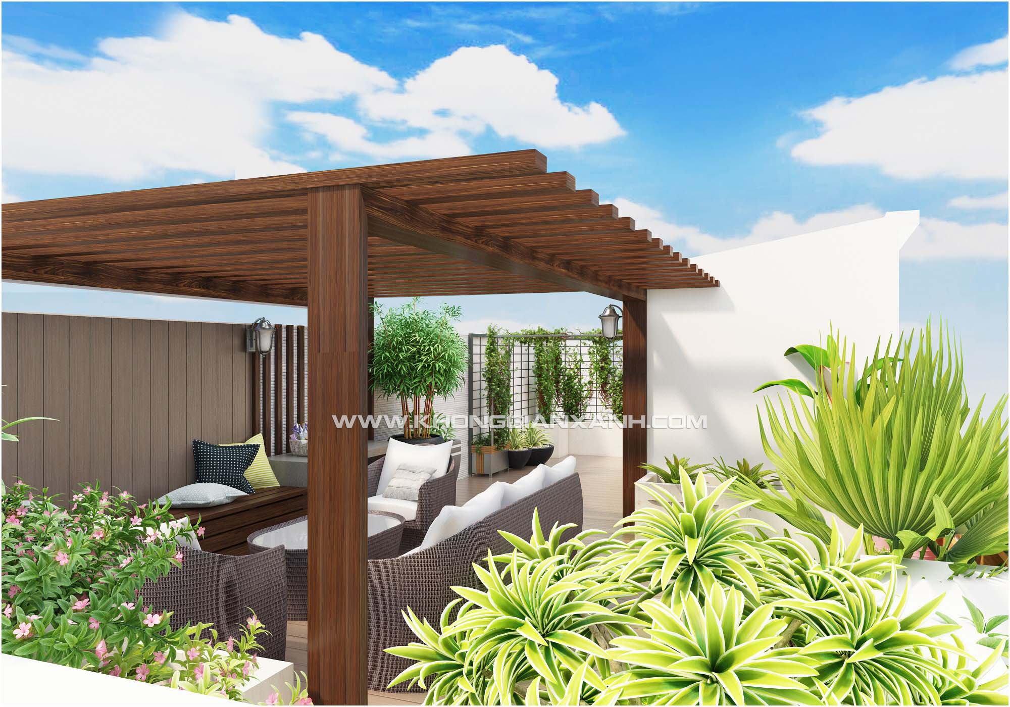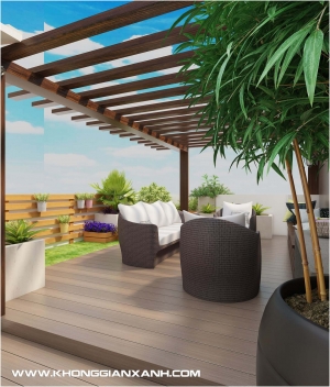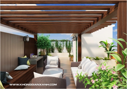 Khu vực sân thượng căn nhà được bố trí lại với hệ thống cây xanh trang trí, giàn treo và ghế ngồi kết hợp cùng thảm cỏ tạo nên một góc xanh cho cả gia đình sau những giờ lao động mệt nhọc,
