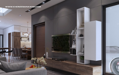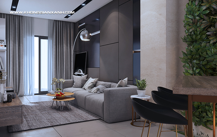 Thiết kế nội thất phòng khách hiện đại với tông màu chủ đạo là màu xám kết hợp với vật liệu nội thất bằng gỗ. Với vách kính cường lực rộng lớn giúp phòng khách luôn tràn ngập ánh sáng tự nhiên mang đến cảm giác thanh thoát, gần gũi với gia chủ. Gia chủ là một người thích cây xanh nên Kiến trúc sư đã đưa những mảng cây xanh vào nhà mang lại không gian thân thiện, không khí trong lành cho không gian tiếp khách.