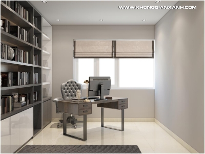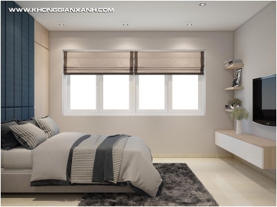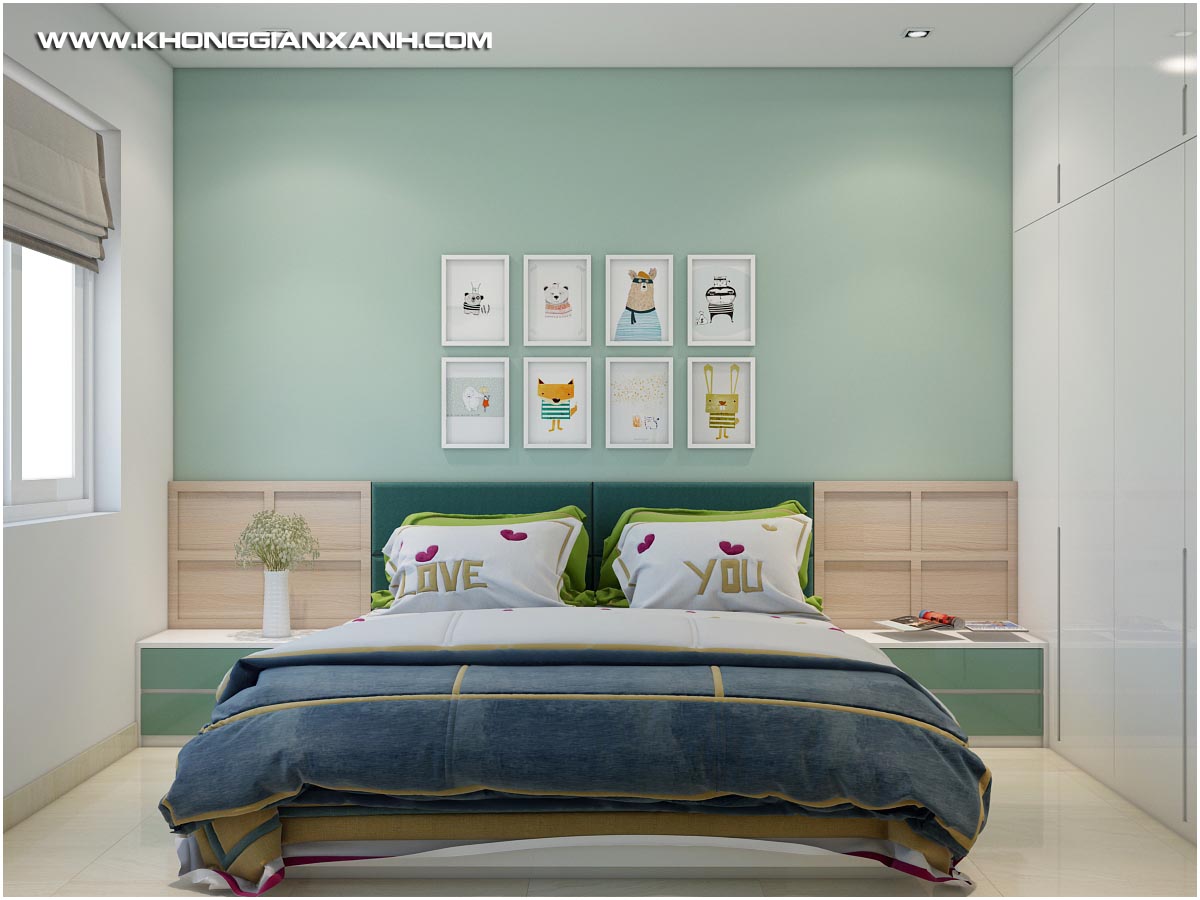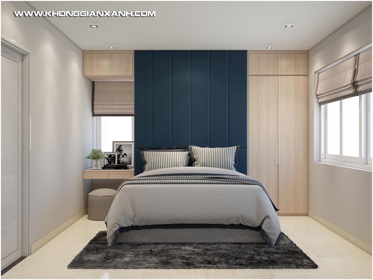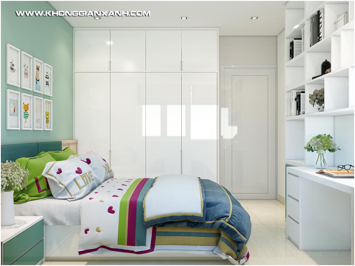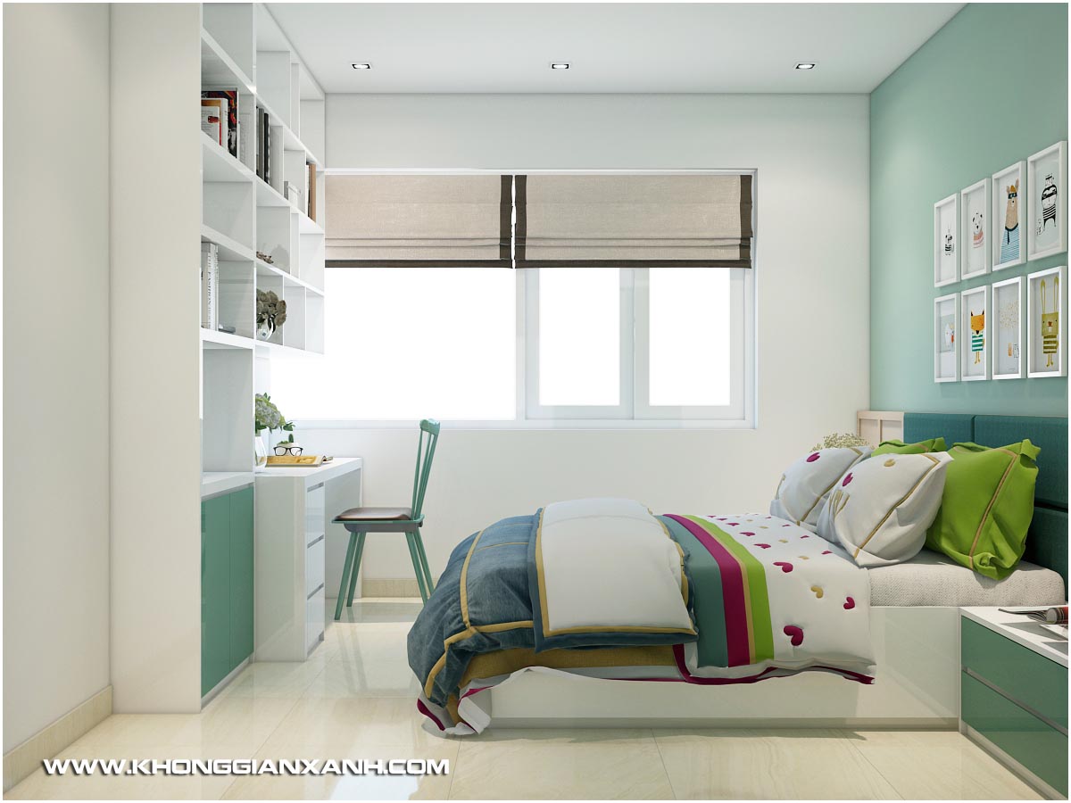 Nếu như không gian phòng khách và bếp là sự pha phối nhẹ nhàng giữa màu sắc của gỗ và màu xanh biển tươi mới, thì không gian phòng ngủ là kết hợp giữa màu xanh ngọc và sắc trắng tinh khiết. Không gian làm việc với hệ kệ tủ tối màu làm nổi bật ấn tượng toàn bộ gian phòng vốn không phải là lớn.