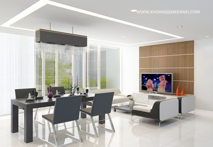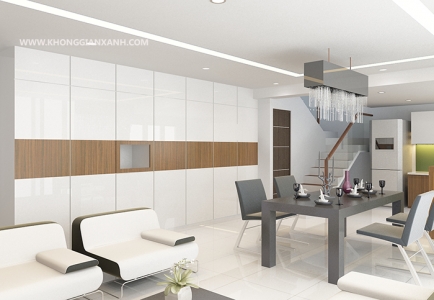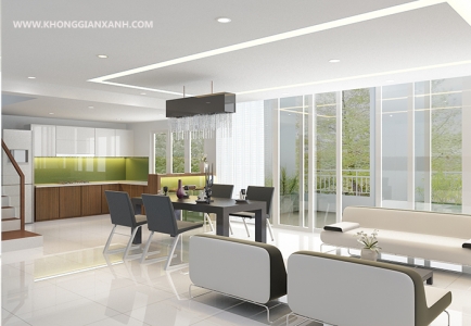 KTS đã ưu ái sử dụng tone màu trắng làm chủ đạo, màu xanh lá tạo điểm nhấn cho Villa. Bàn ăn được đặt giữa phòng khách và bếp nhằm tiếp nối hai không gian lại với nhau.  không vách ngăn tiết kiệm diện tích, tạo ra không khí ấm áp, gần gũi và không gian sang trọng.
