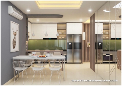 Không gian bếp và phòng ăn được làm nổi bật với hệ thống tủ bếp và vách ốp tường dùng gỗ công nghiệp MDF phủ Melamin màu tối kết hợp trắng. Trên nền màu tổng thể, bàn ăn với chi tiết nhẹ nhàng phù hợp mục tiêu sử dụng tưởng chừng đơn giản sẽ trở thành một điểm nhấn phong cách.
