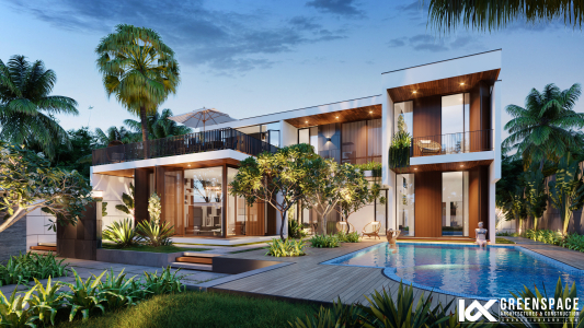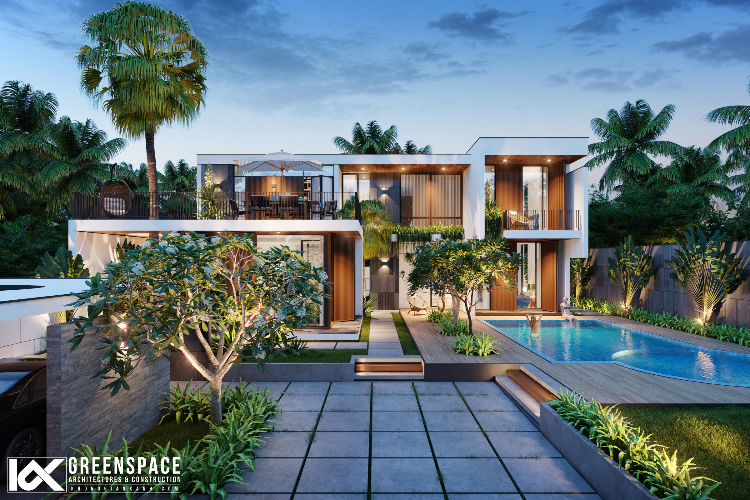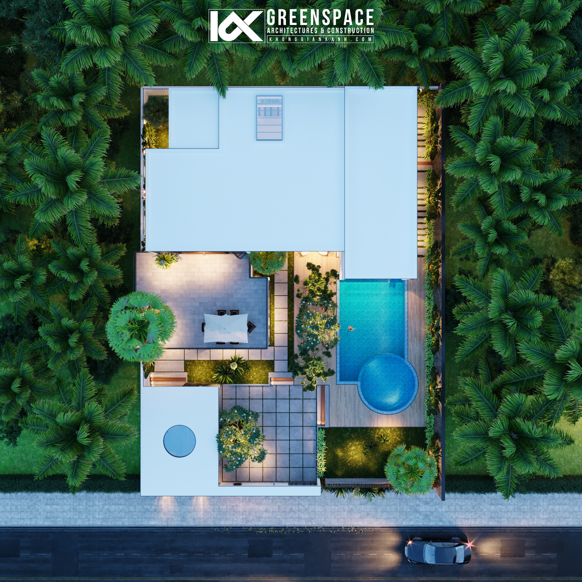 Khối hình phân tán với điểm nhấn là khu hồ bơi diện tích lớn kết hợp hệ thống sân vườn được phân cấp hài hòa tạo nên một tổng thể sinh động và giàu sức sống. Các không gian chức năng trong nhà như: khu nhà xe, phòng khách, phòng ăn và hiên trà đạo được bố trí với view mở rộng tối đa tạo sự giao kết không gian rộng và mở.