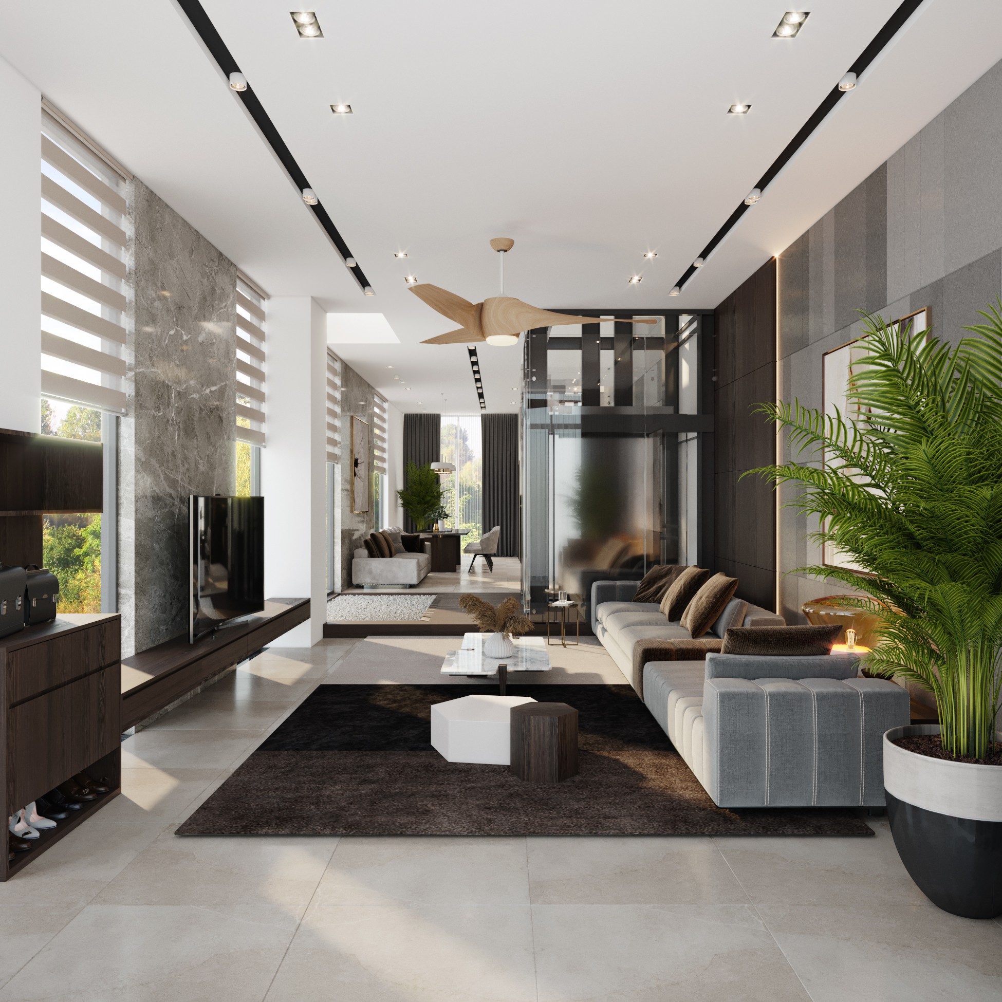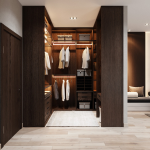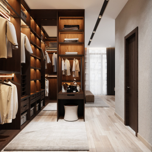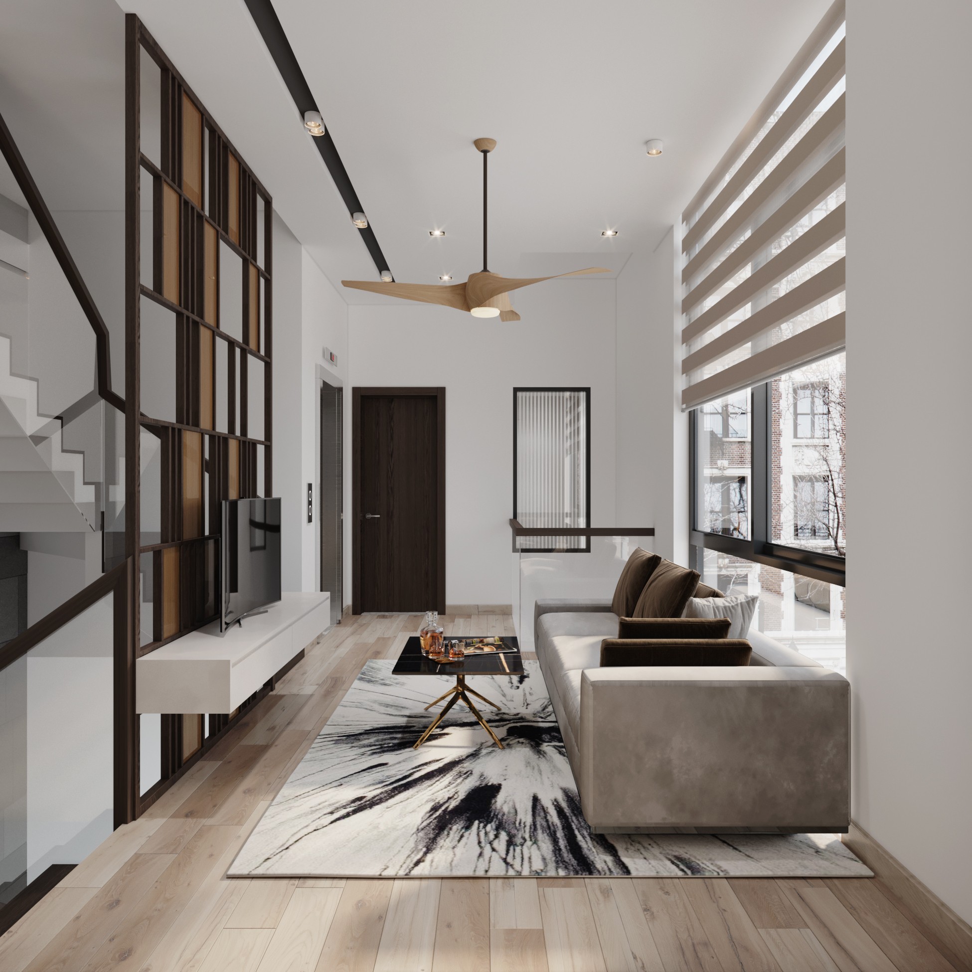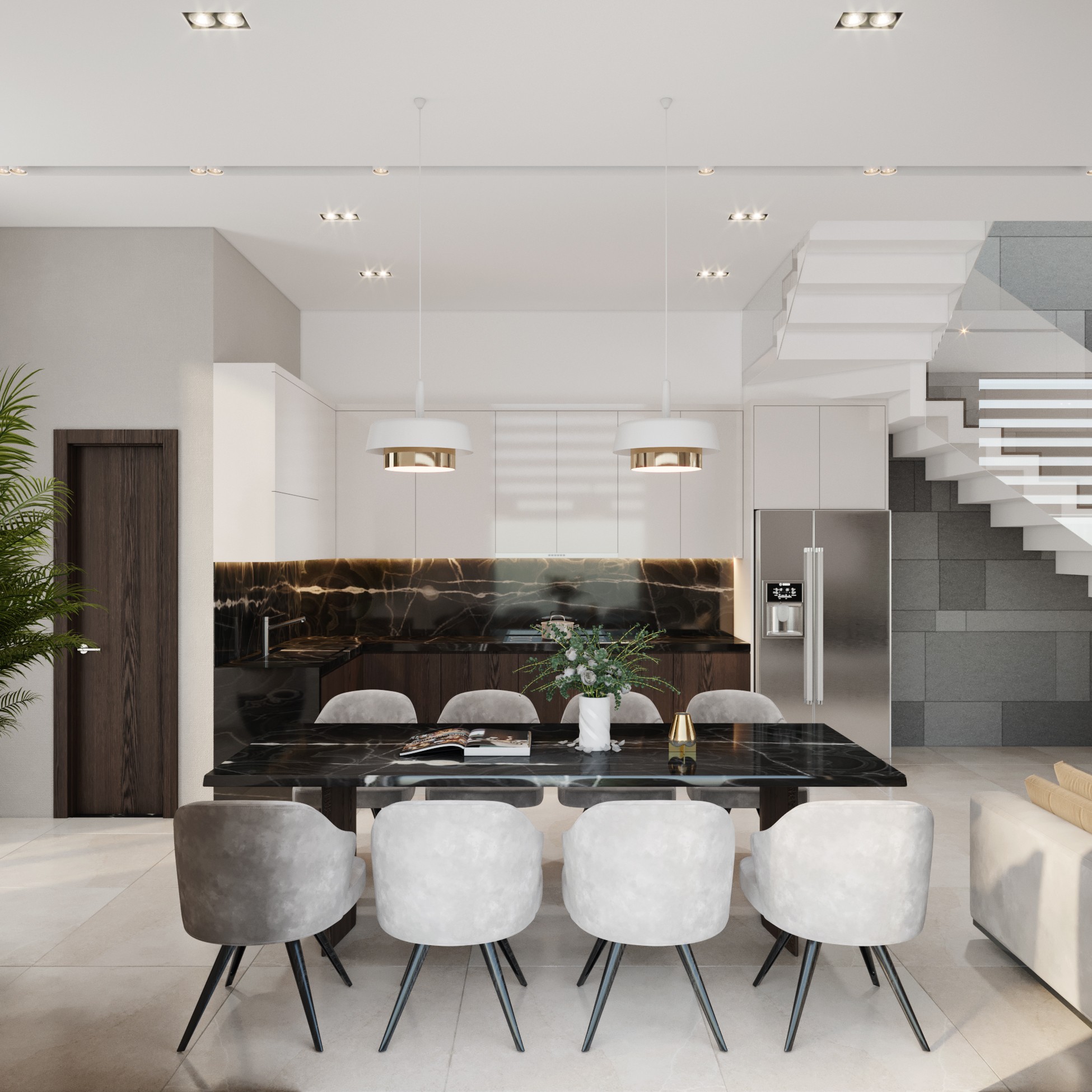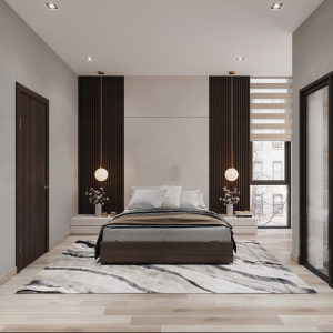 Trên nền trung tính với tone trắng – xám của không gian, màu nâu gỗ óc chó trở thành điểm nhấn sáng giá của ngôi nhà. Sự kết hợp tương phản tạo ra một chất riêng, nét ấn tượng riêng xuyên suốt ngôi nhà.
