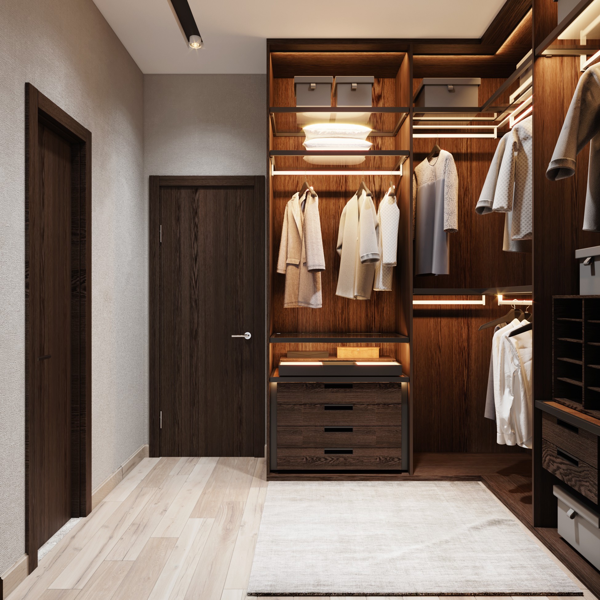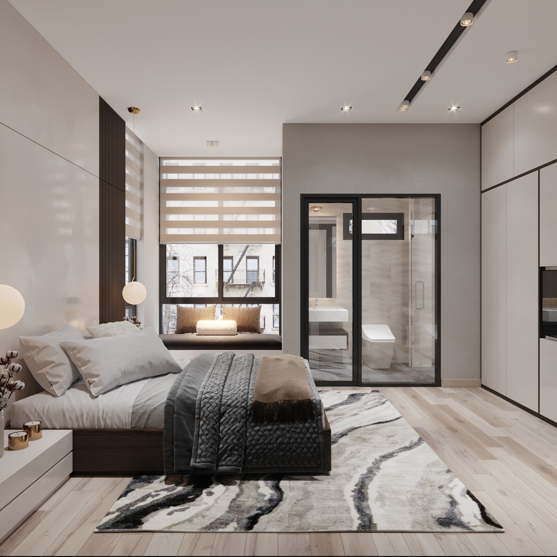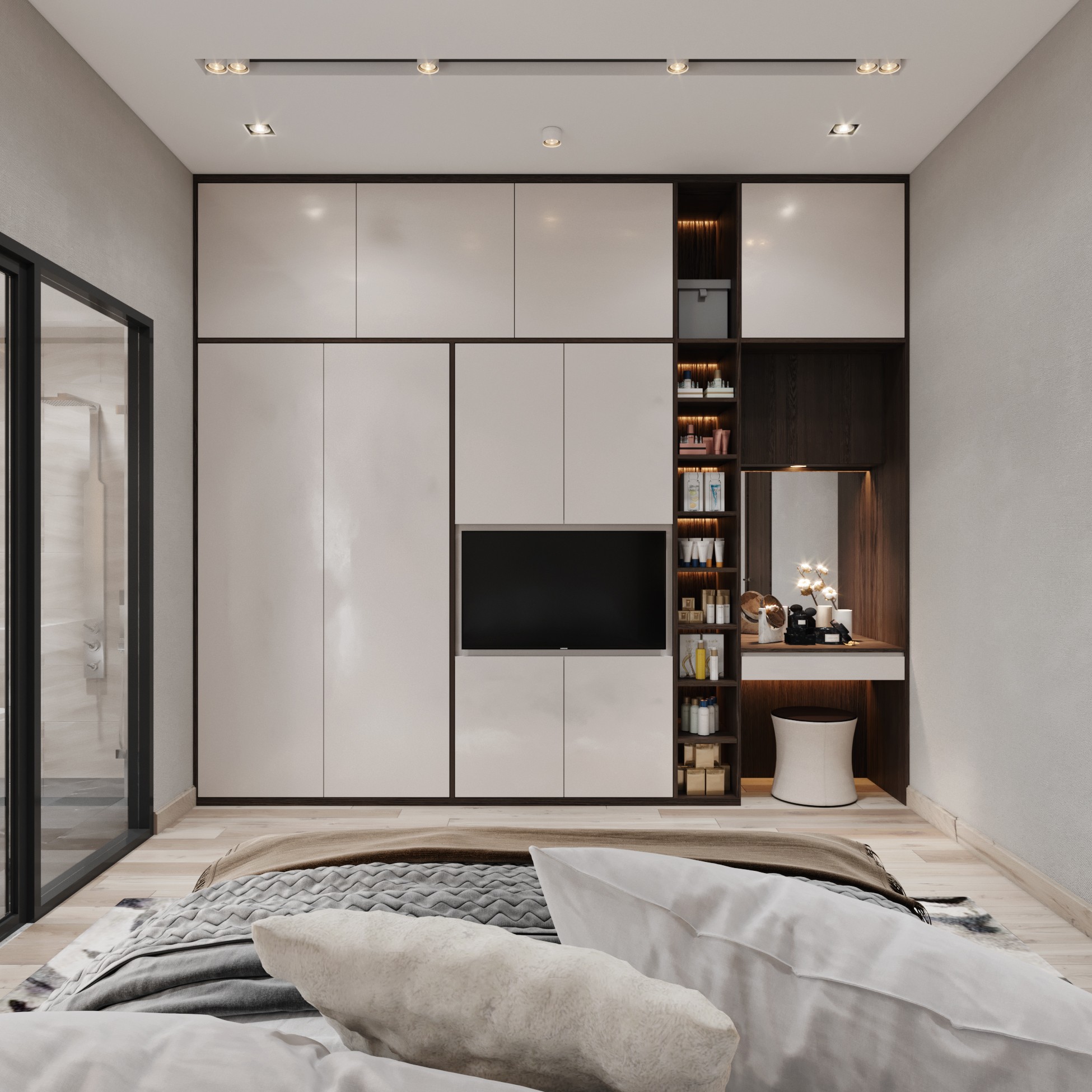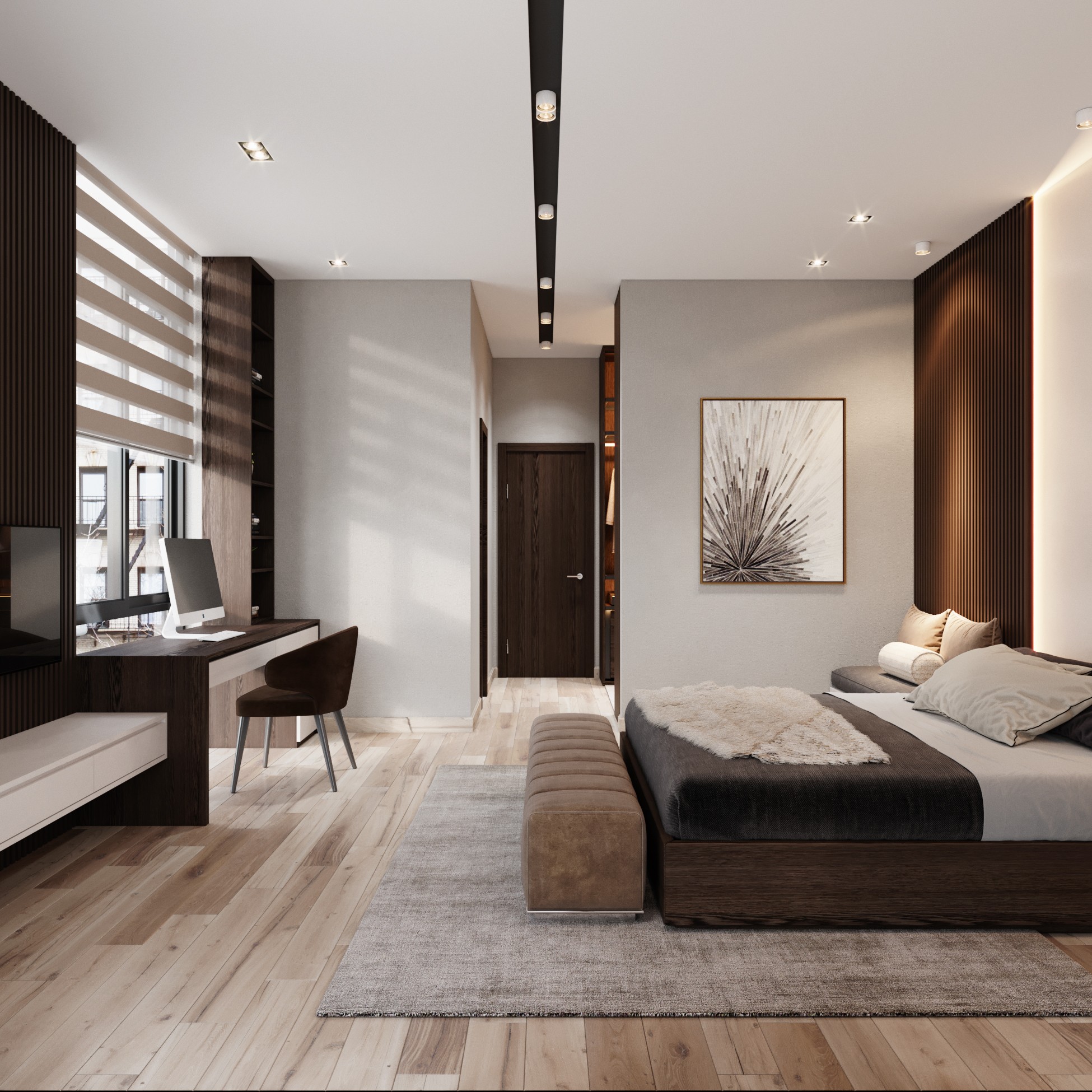 Trên nền trung tính với tone trắng – xám của không gian, màu nâu gỗ óc chó trở thành điểm nhấn sáng giá của ngôi nhà. Sự kết hợp tương phản tạo ra một chất riêng, nét ấn tượng riêng xuyên suốt ngôi nhà.