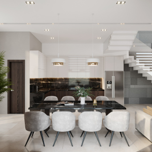 Thiết kế sử dụng các chất liệu điểm nhấn như đá marble cho khu bếp, gạch ốp trang trí cho phòng khách, kết hợp với hệ thống đèn hắt trang trí màu vàng ấm… tất cả đều tạo nên sự nhấn nhá hài hòa, thanh lịch cho ngôi nhà.