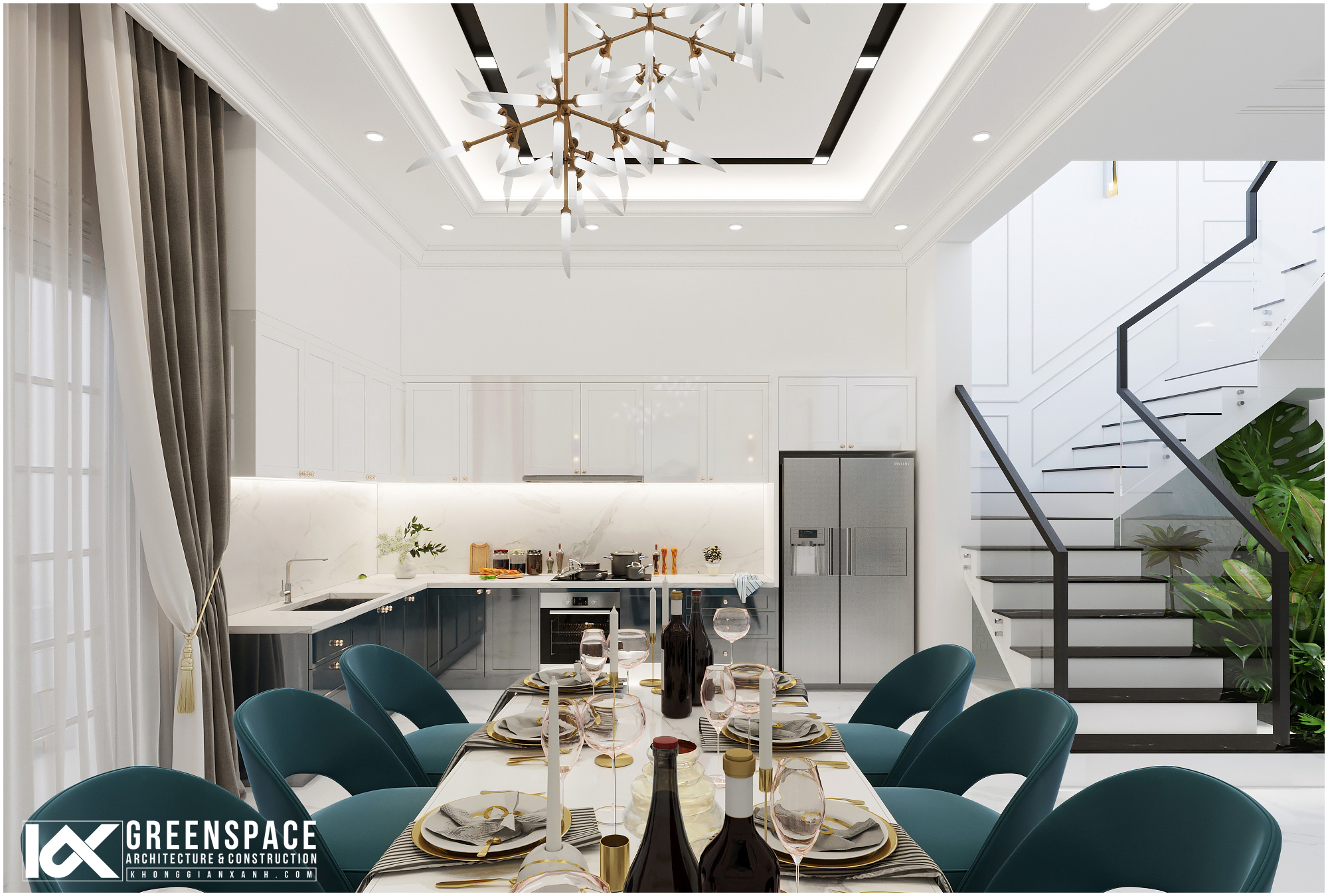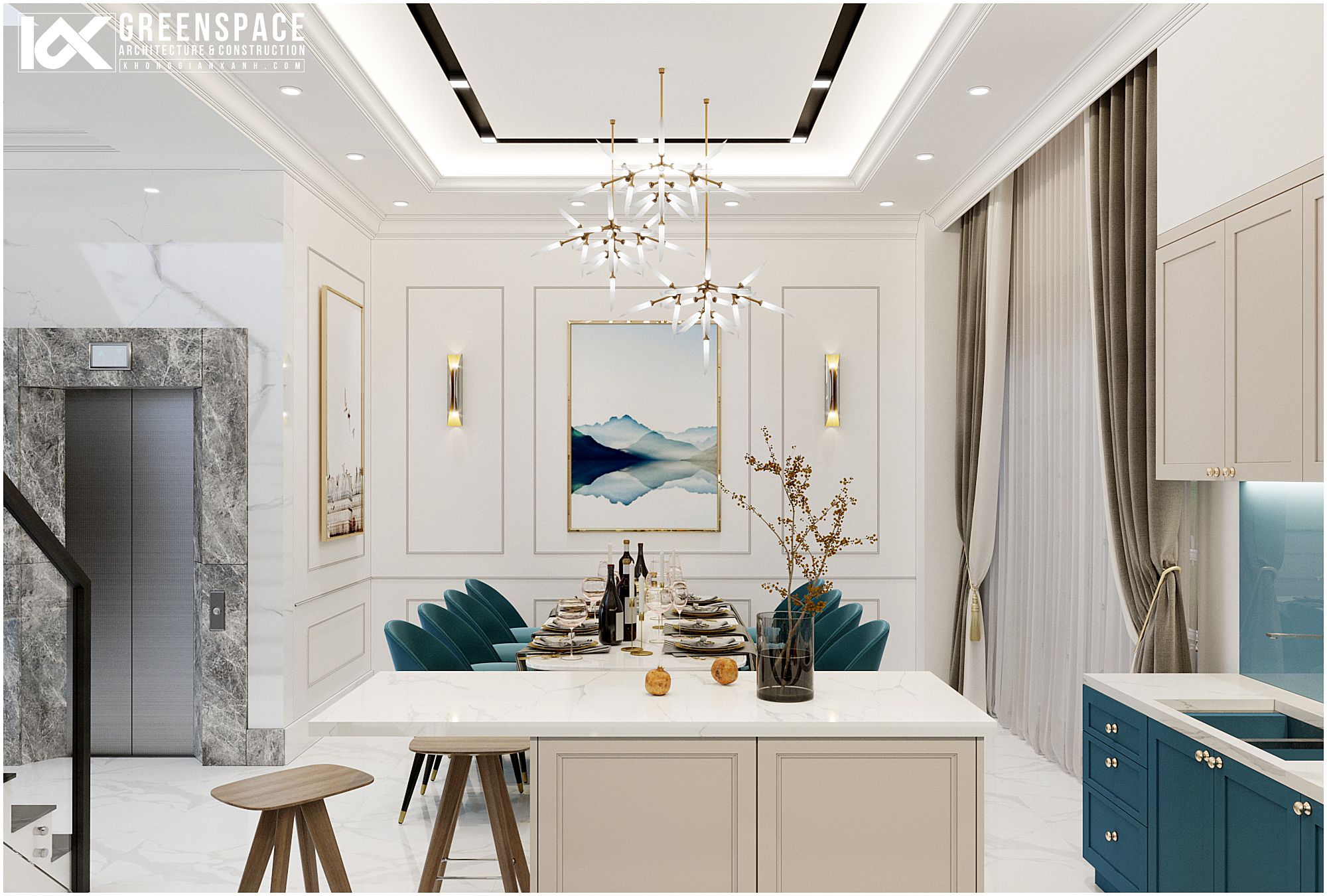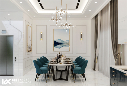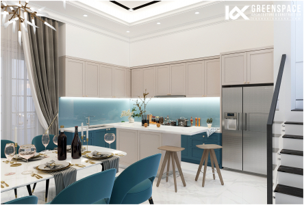 Phòng ăn nổi bật với bộ bàn ăn màu xanh sẫm ngăn cách với khu bếp bằng một đảo bếp nhỏ. Đường nét màu sắc hiện đại, kết hợp với những chi tiết phào chỉ tân cổ điển công với các chi tiết đèn chùm trang trí tạo nên một thiết kế nội thất nhà phố tân cổ điển sang trọng, hiện đại và đẳng cấp.